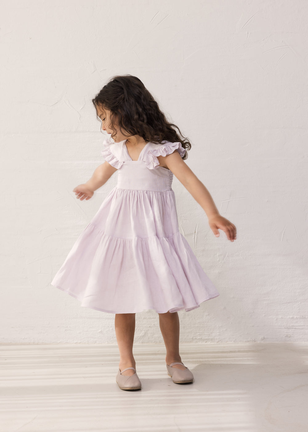 Sleeveless dress for children in an airy and comfortable linen quality, with wide straps and ruffles on the shoulder. The dress has elastic smock detail at the back for a good fit. The length of the dress goes above the knee.