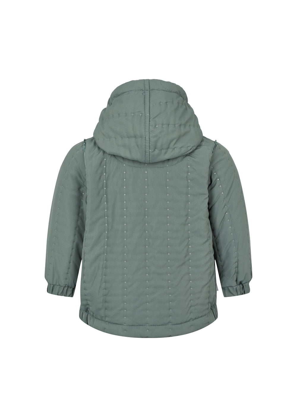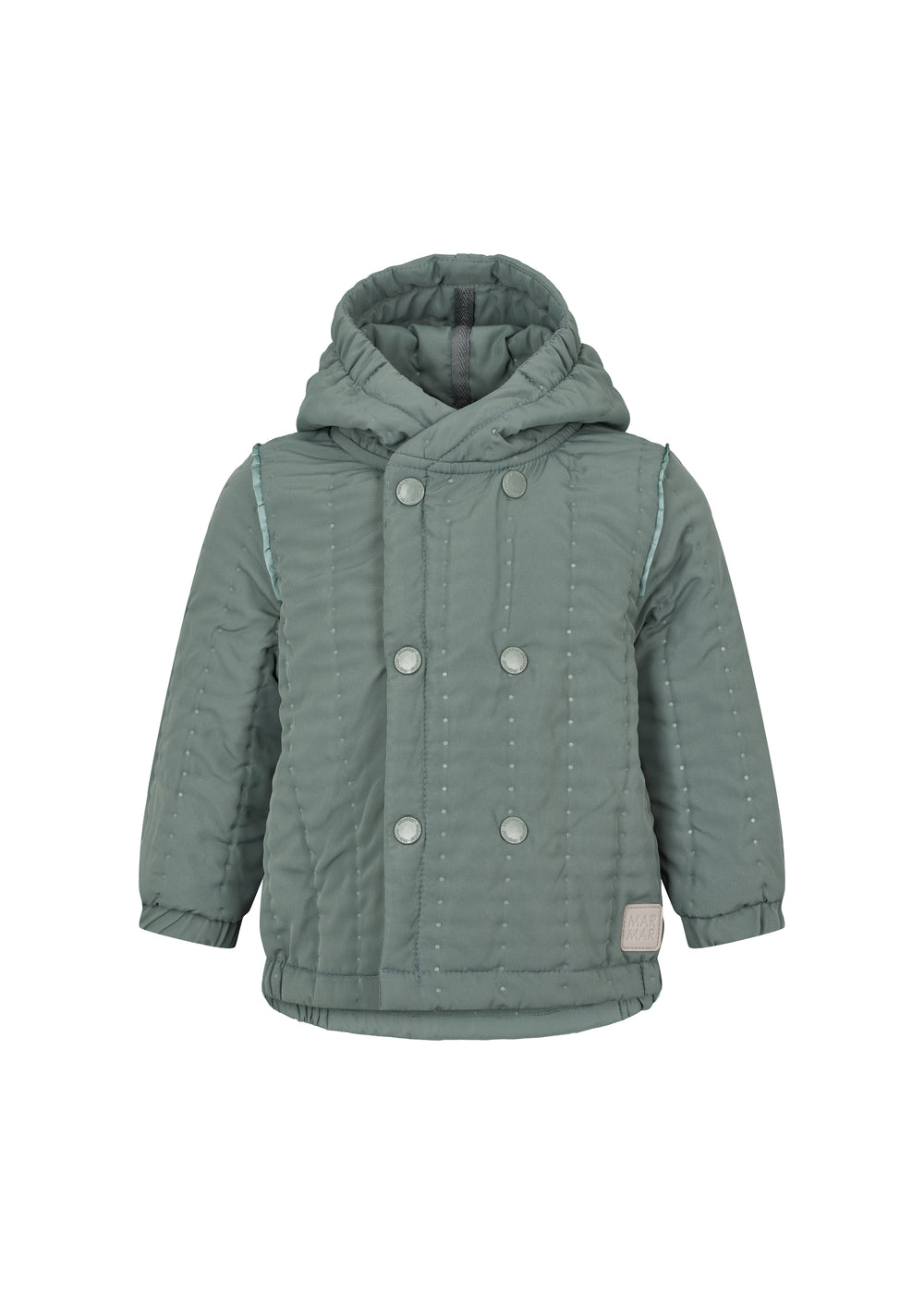 støvet grøn termojakke med hætte og dobbeltradet knaplukning