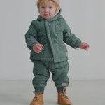 Baby iført støvet grøn termojakke og bukser, står og kigger til siden