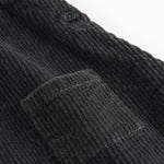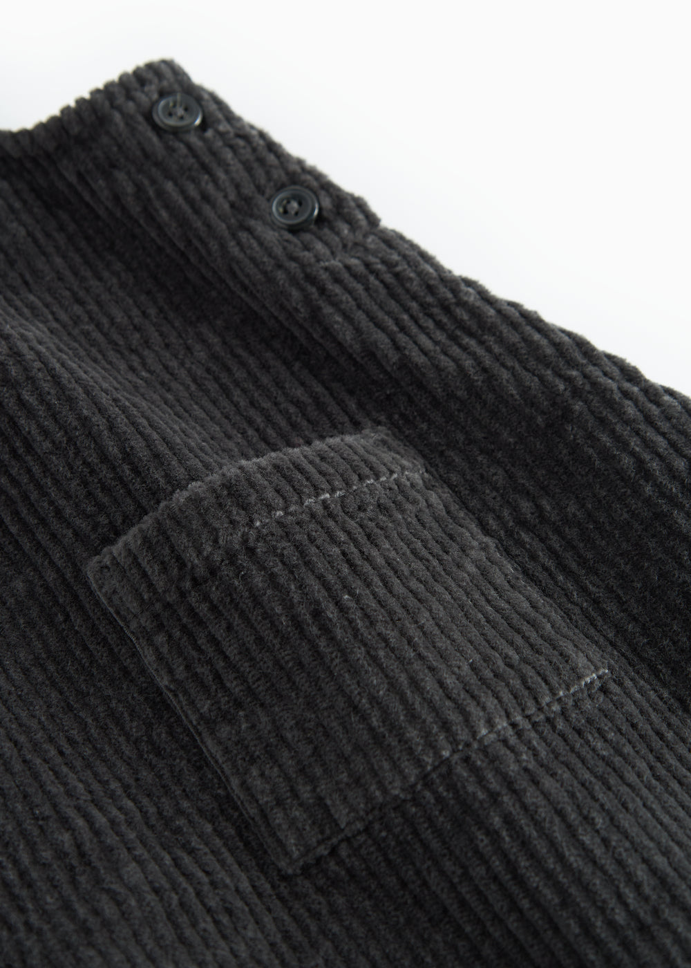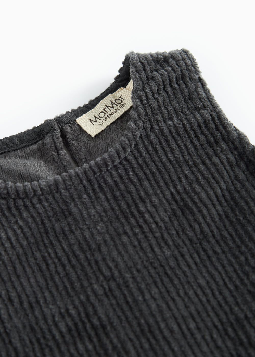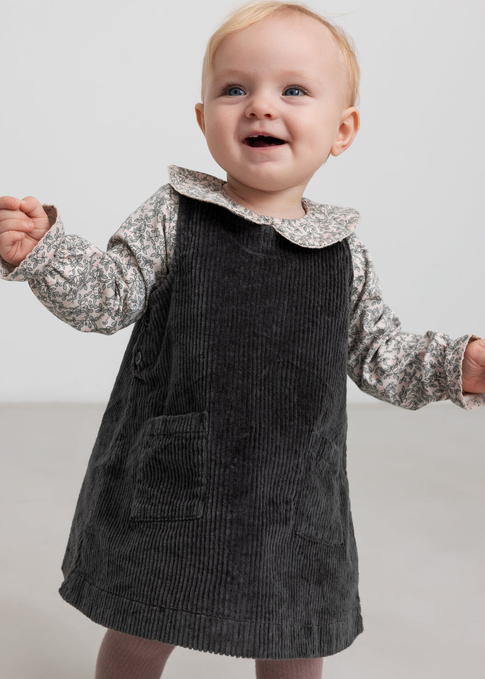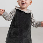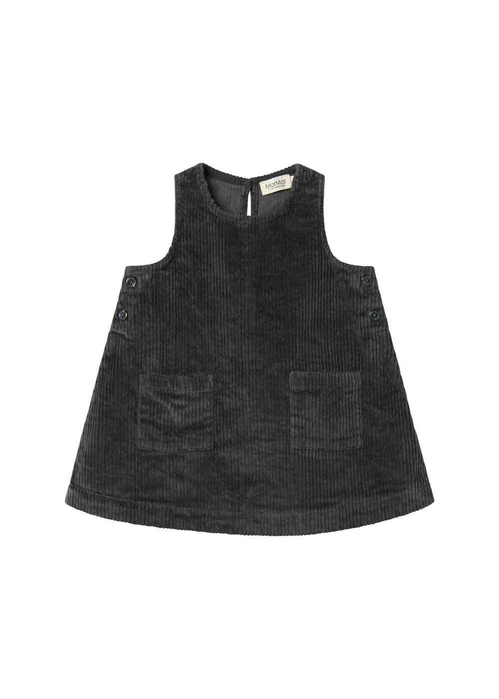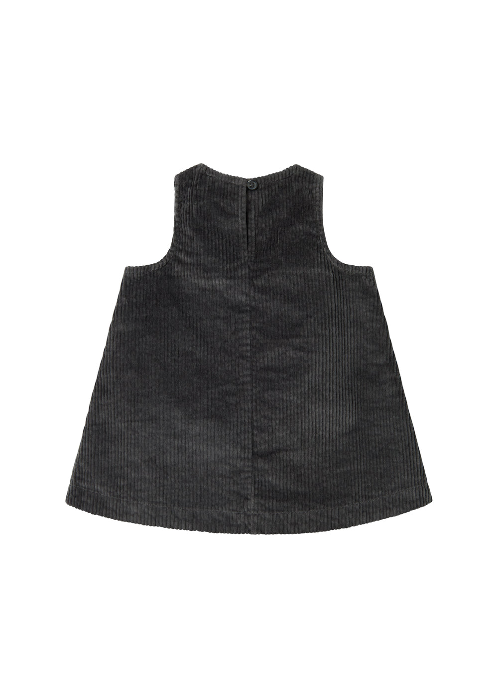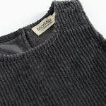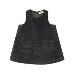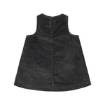 Loose-fitting sleeveless velvet dress for baby with two pockets in the front and button closure on the sides and back, making the dress easy to take on and off.