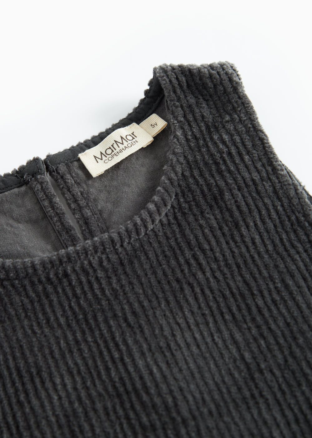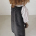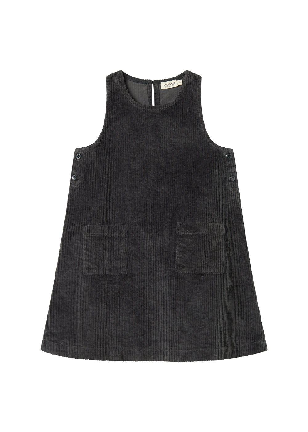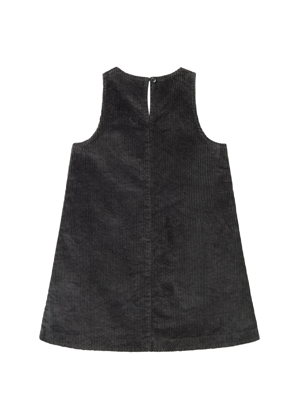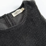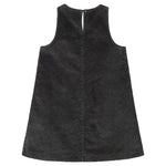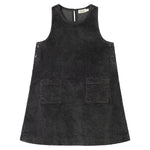 Loose-fitting sleeveless velvet dress for children with two pockets in the front and button closure on the sides and back, making the dress easy to take on and off.