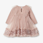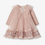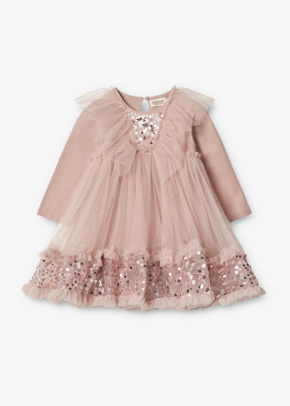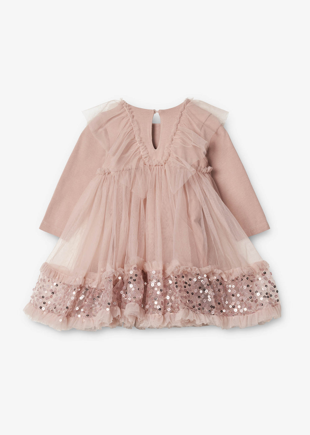 Festive dress for the little ones with sleeves and lots of volume, beautiful tulle ruffles and sequins. The dress has a built-in comfortable bodystocking with button closure, which makes it easy to change diapers. The length of the dress goes above the knee.