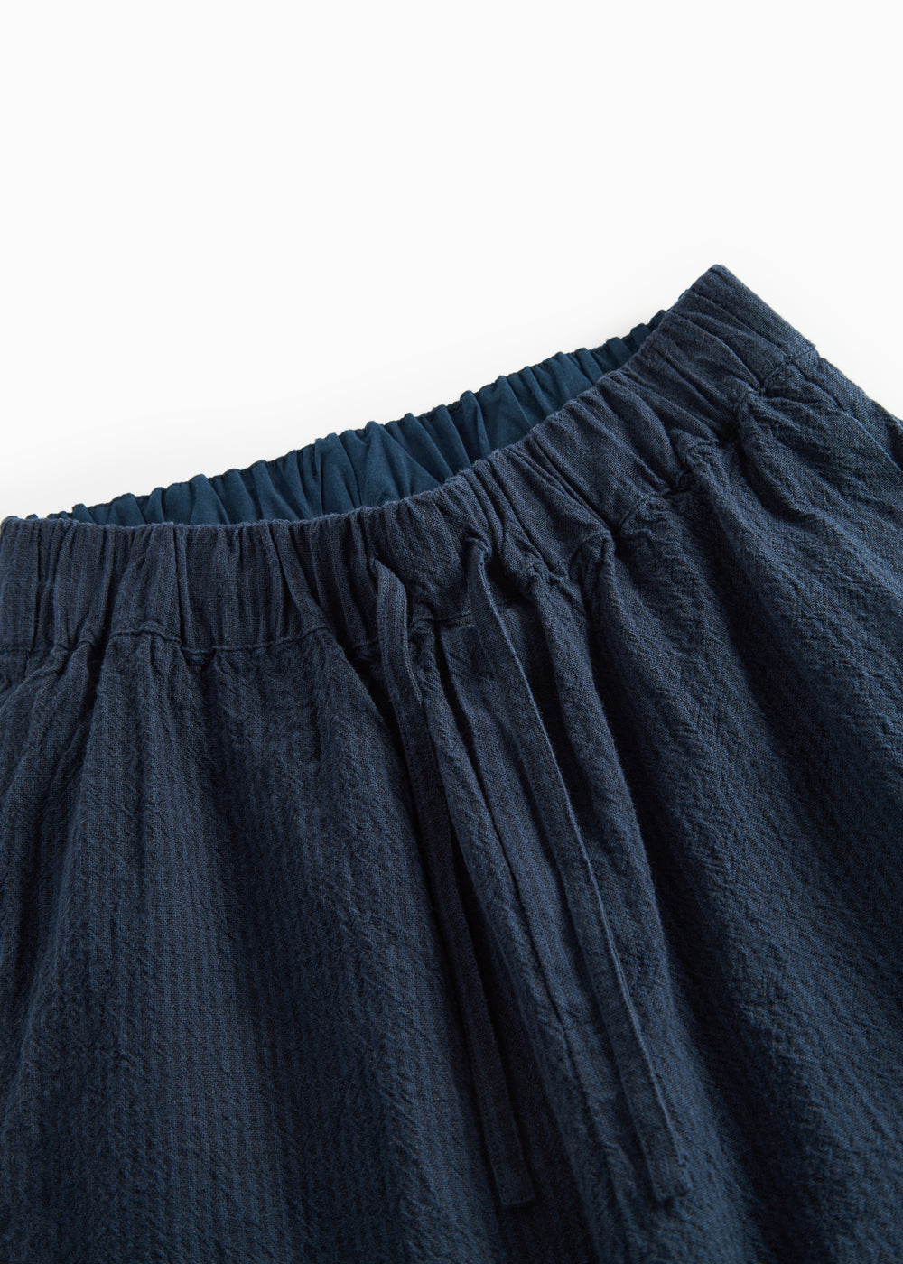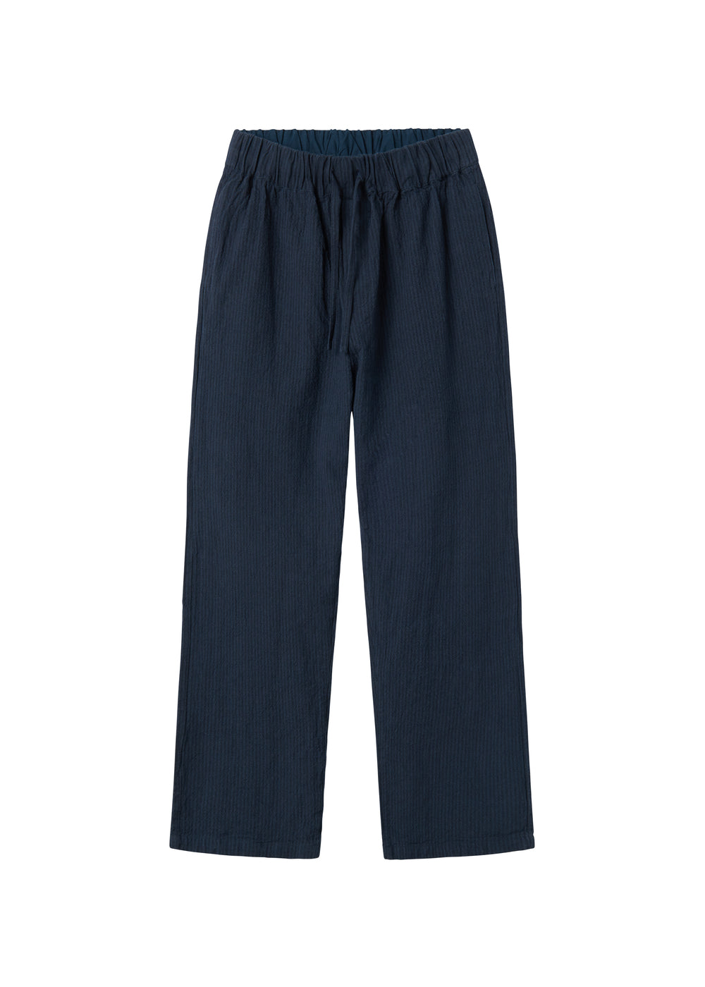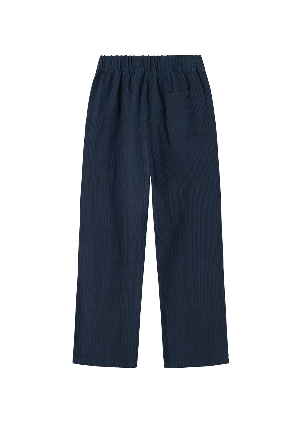 Pants in striped chambray denim for women with a loose fit and a pocket on the back as well as elastic and a tie at the waist.