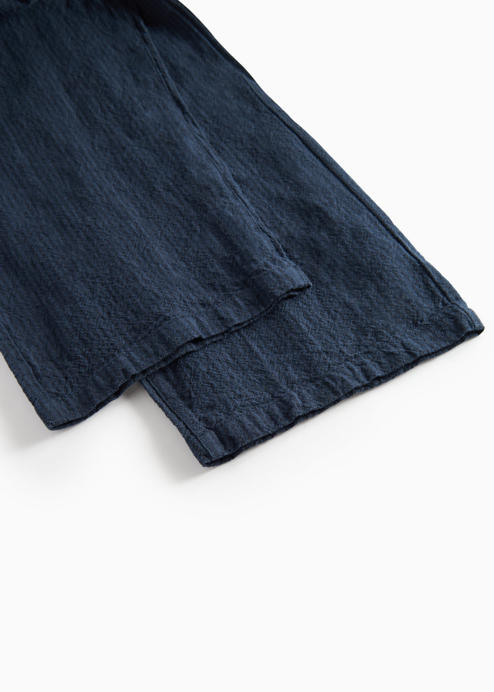 Detaljebillede af mørkeblå damebukser med elastik og let tekstur