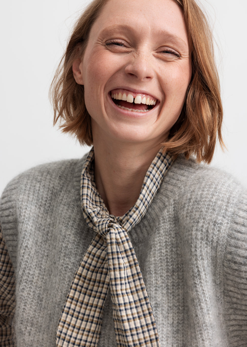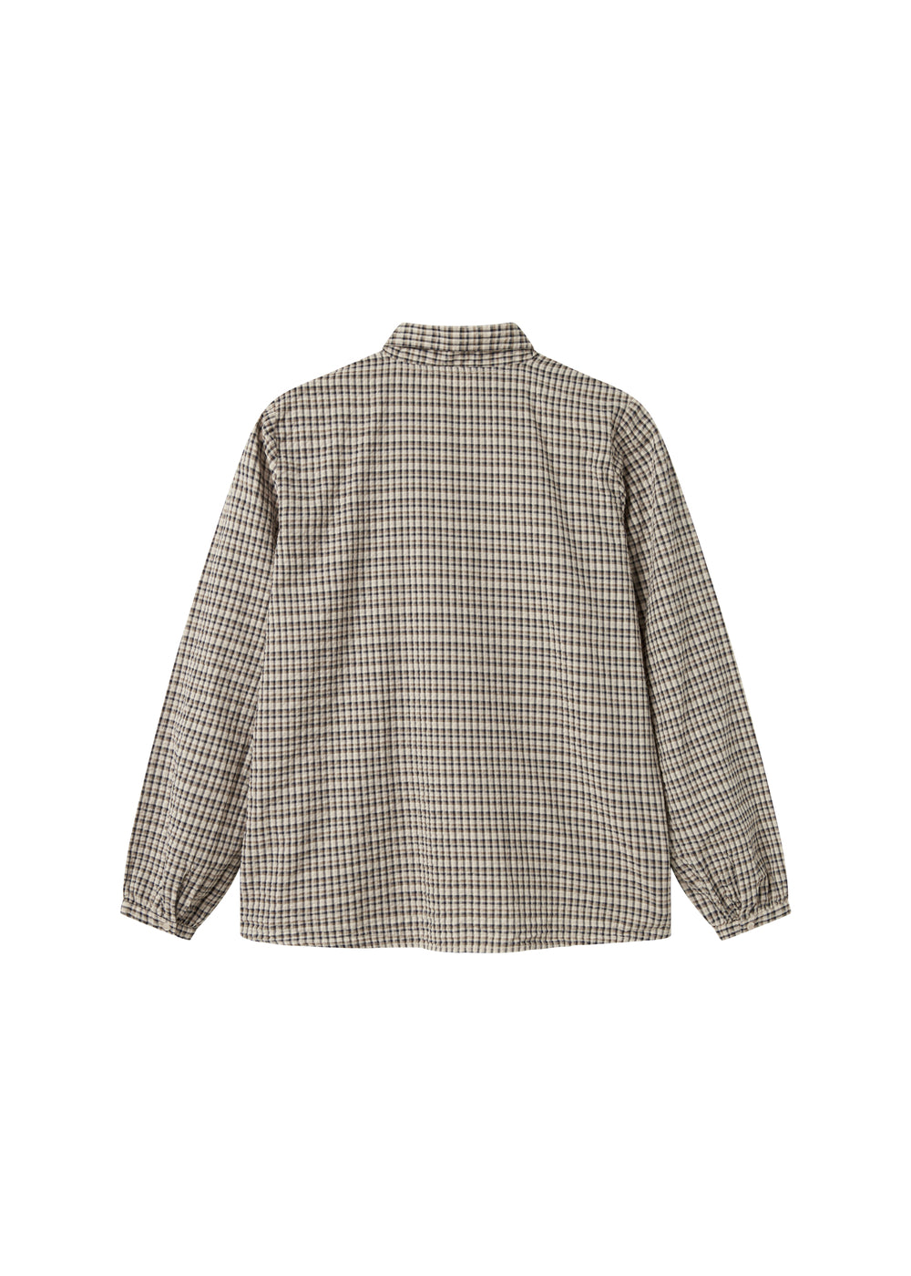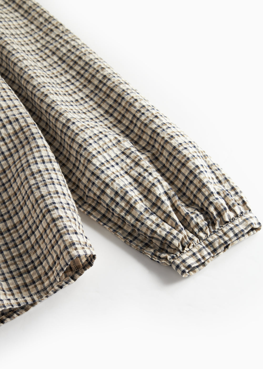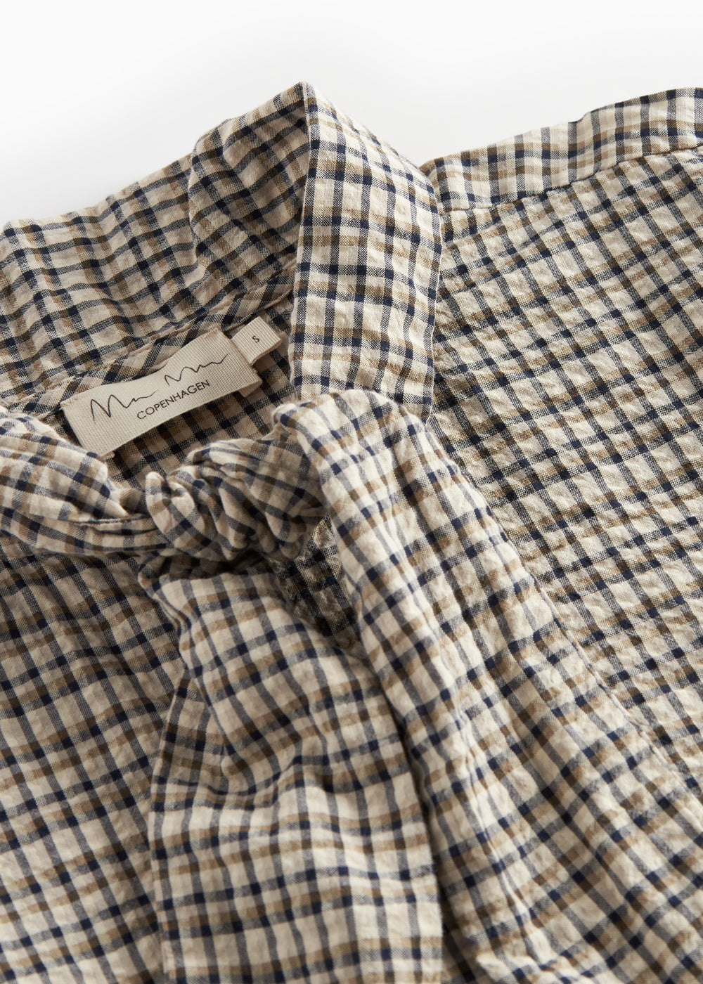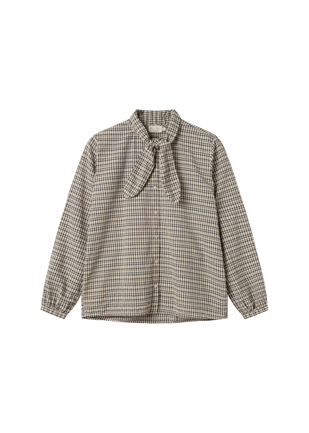 Long-sleeved shirt in crepe cotton for women with button closure and a nice neck bow at the front. The shirt has a comfortable fit.
