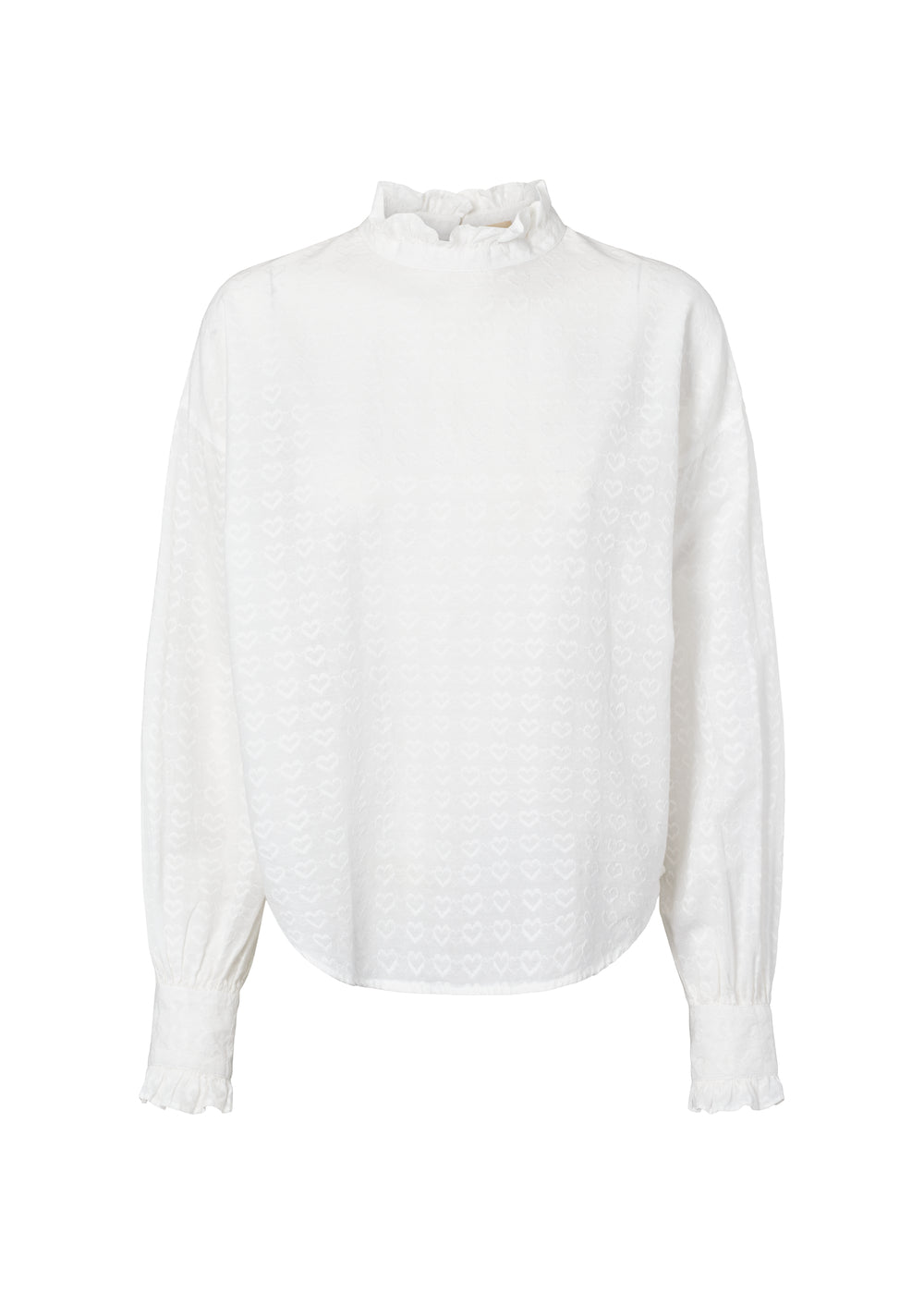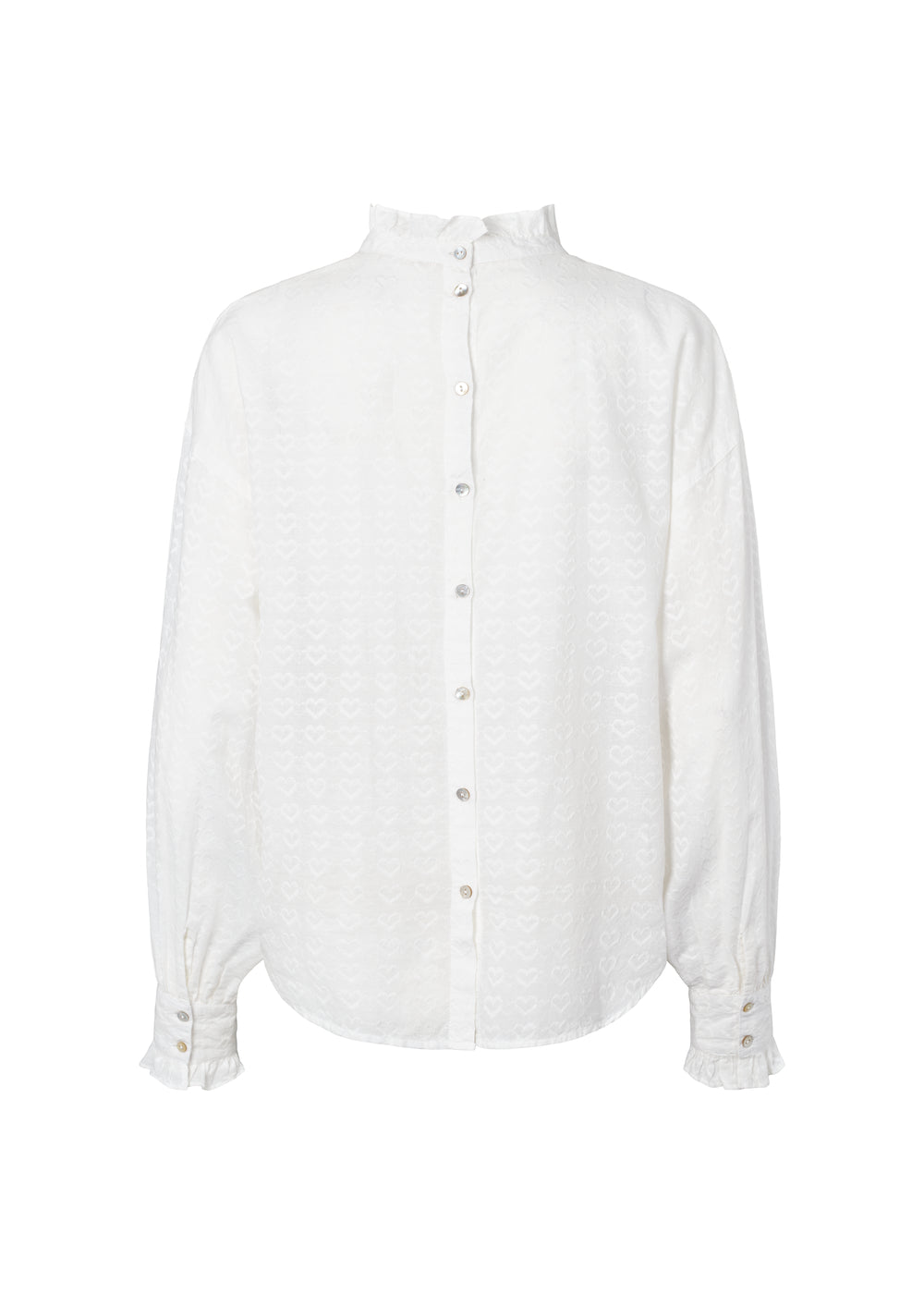 Women's shirt with fine heart embroidery, high ruffle collar, voluminous sleeves and buttons at the back