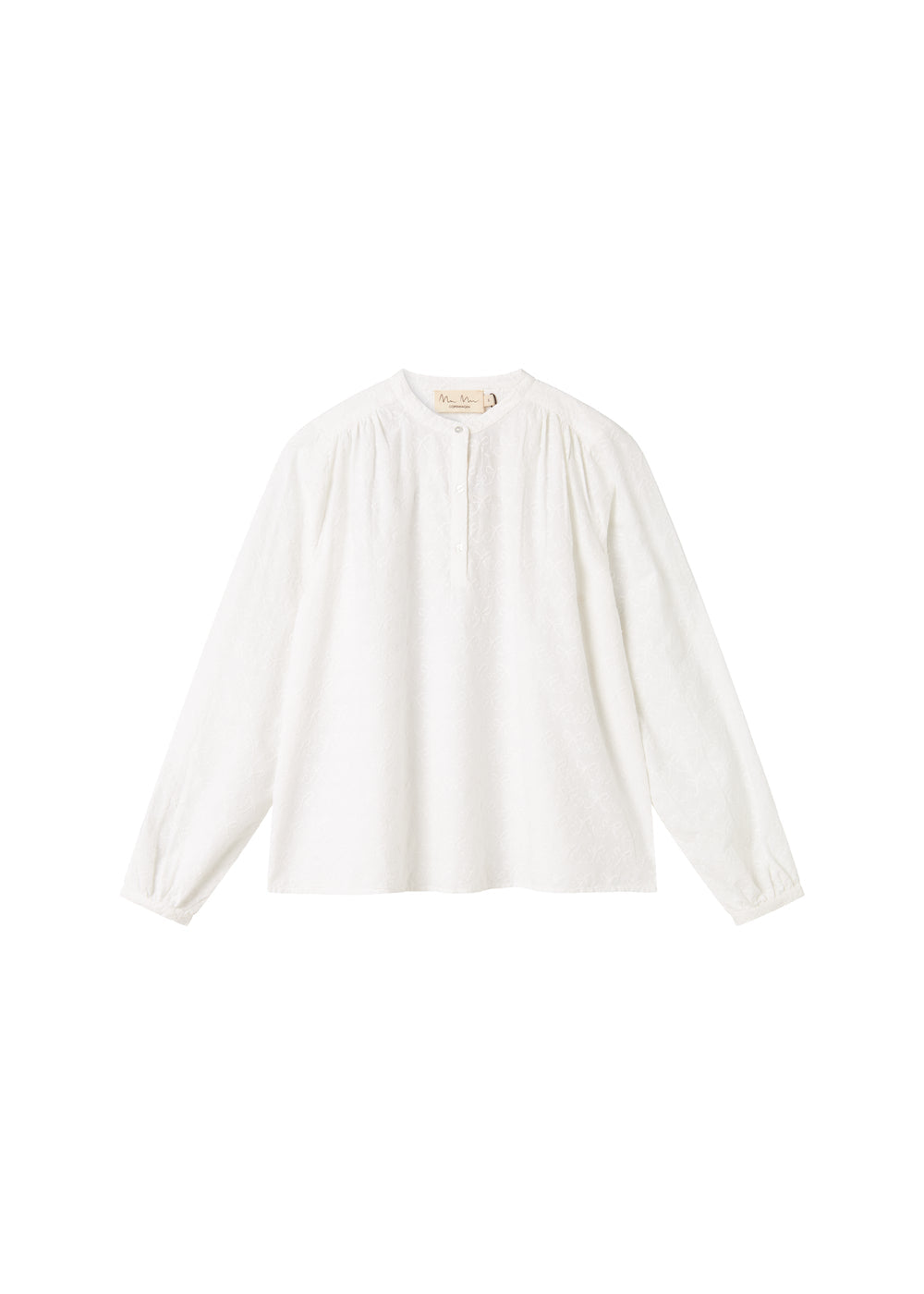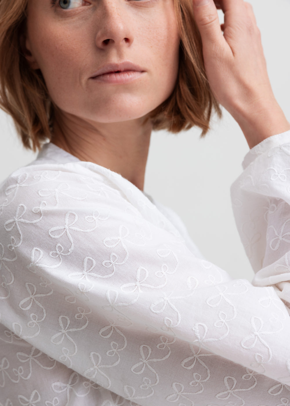 Women's shirt blouse in soft cotton with tone-on-tone embroidered bows. The shirt has long sleeves and closes with small buttons at the front. An elegant style that is perfect for both everyday wear and special occasions.