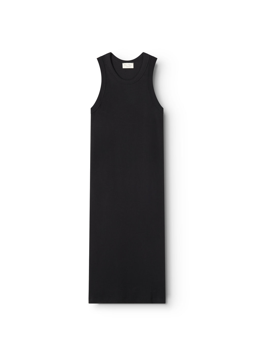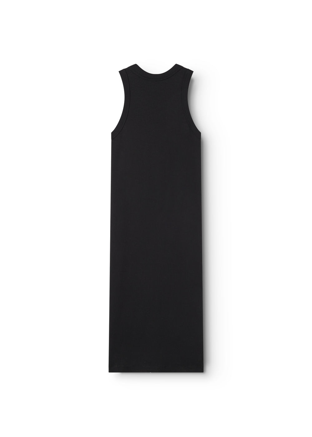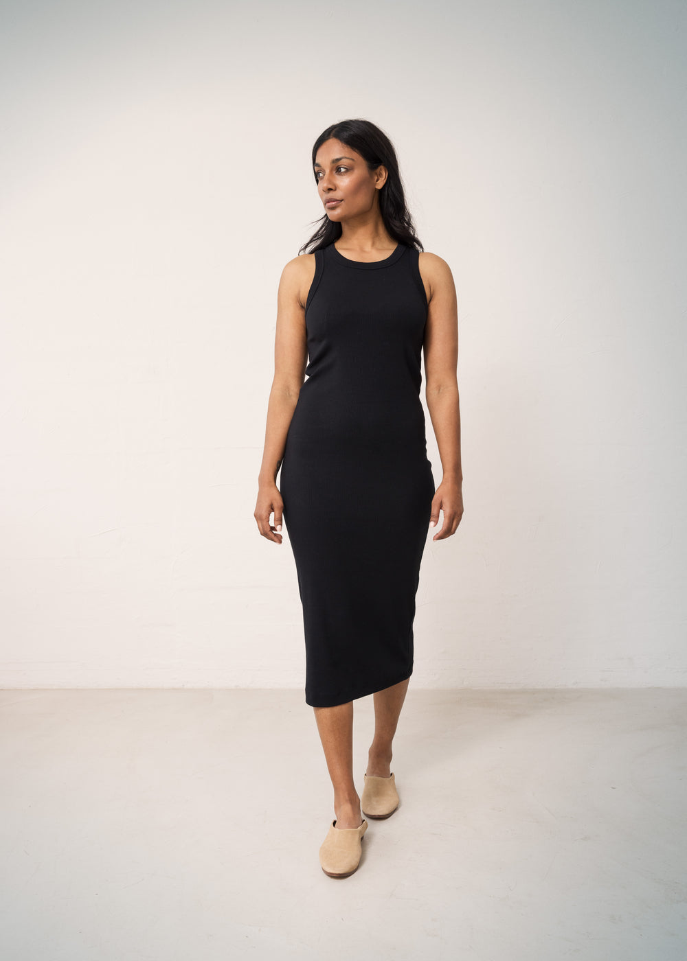 Ribbed tank top dress for women with a round neck and a tight fit. The length of the dress goes below the knee. The dress is soft, stretchy and comfortable to wear.
