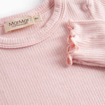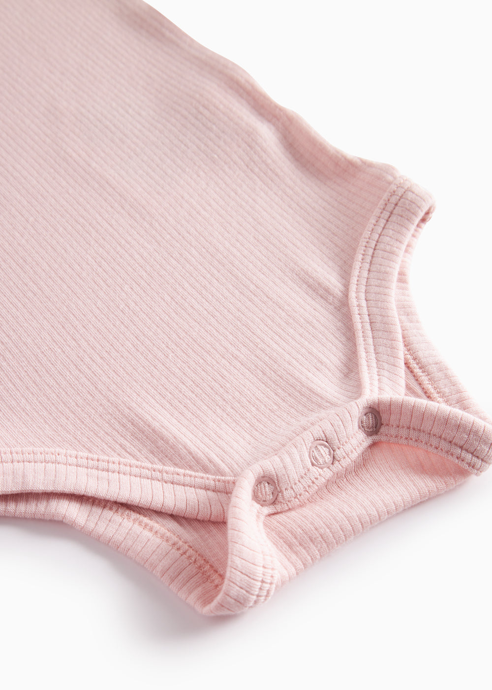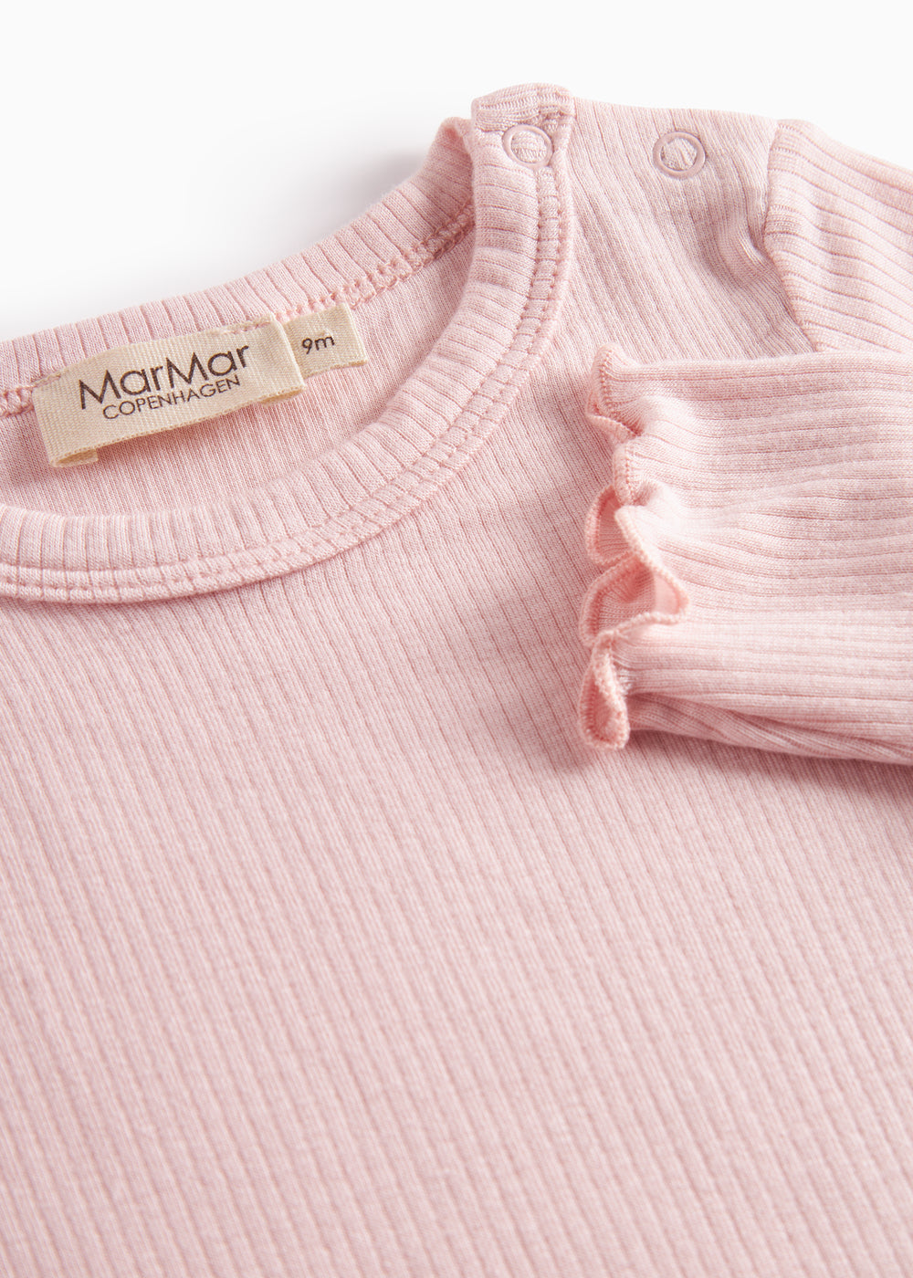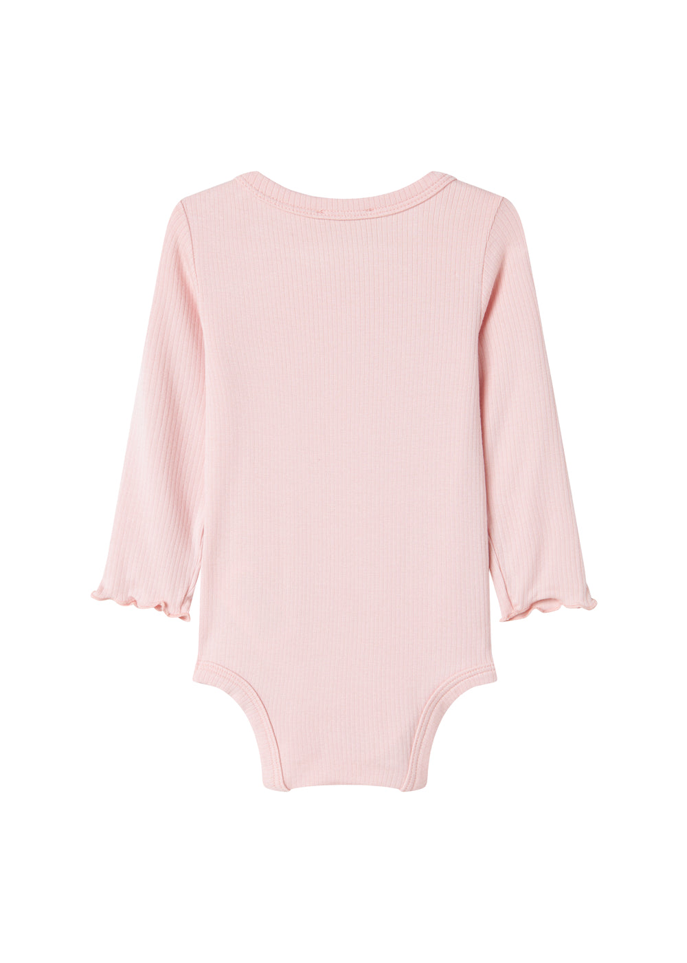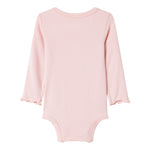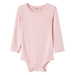 Simple long-sleeved bodystocking with ruffled sleeves that close with snaps on the left shoulder and between the legs for easy diaper changes. The bodystocking is incredibly soft, very stretchy and comfortable to wear.