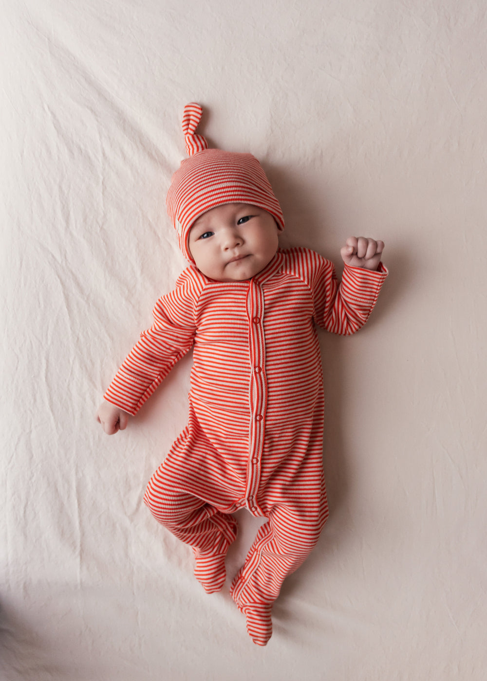 Baby iført rød og hvid stribet heldragt sover i favnen på en voksen