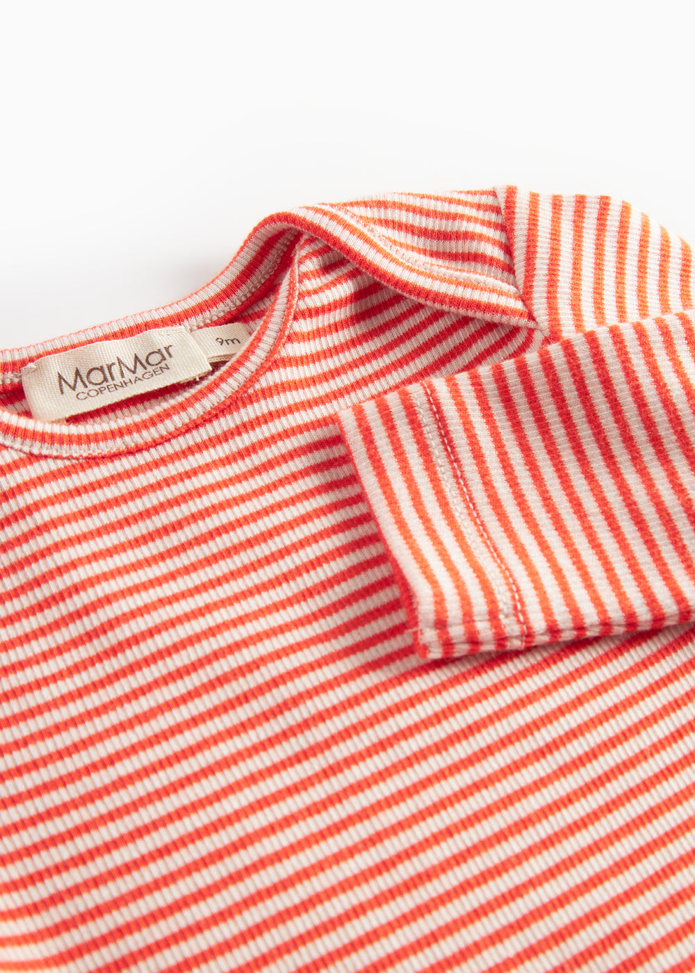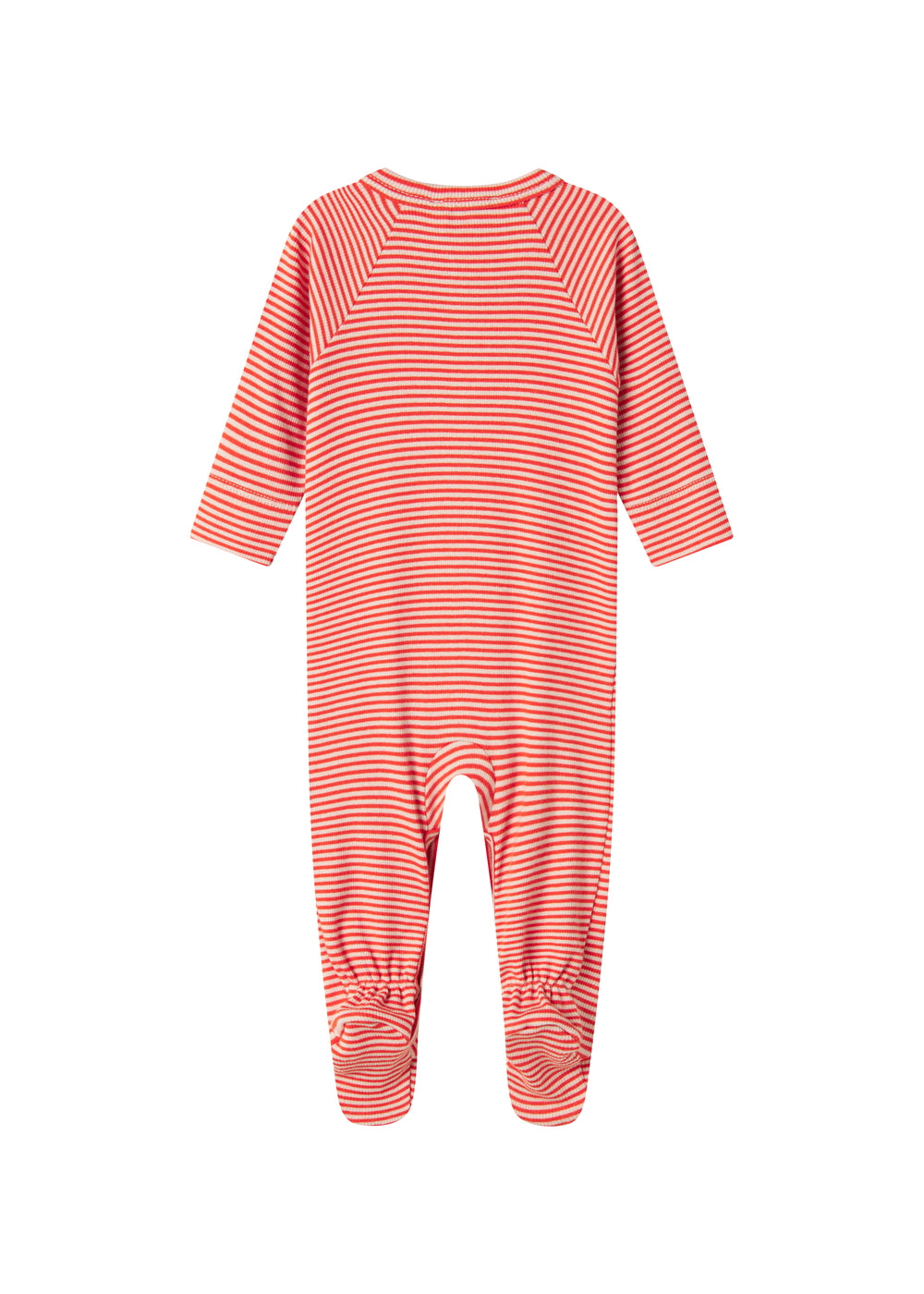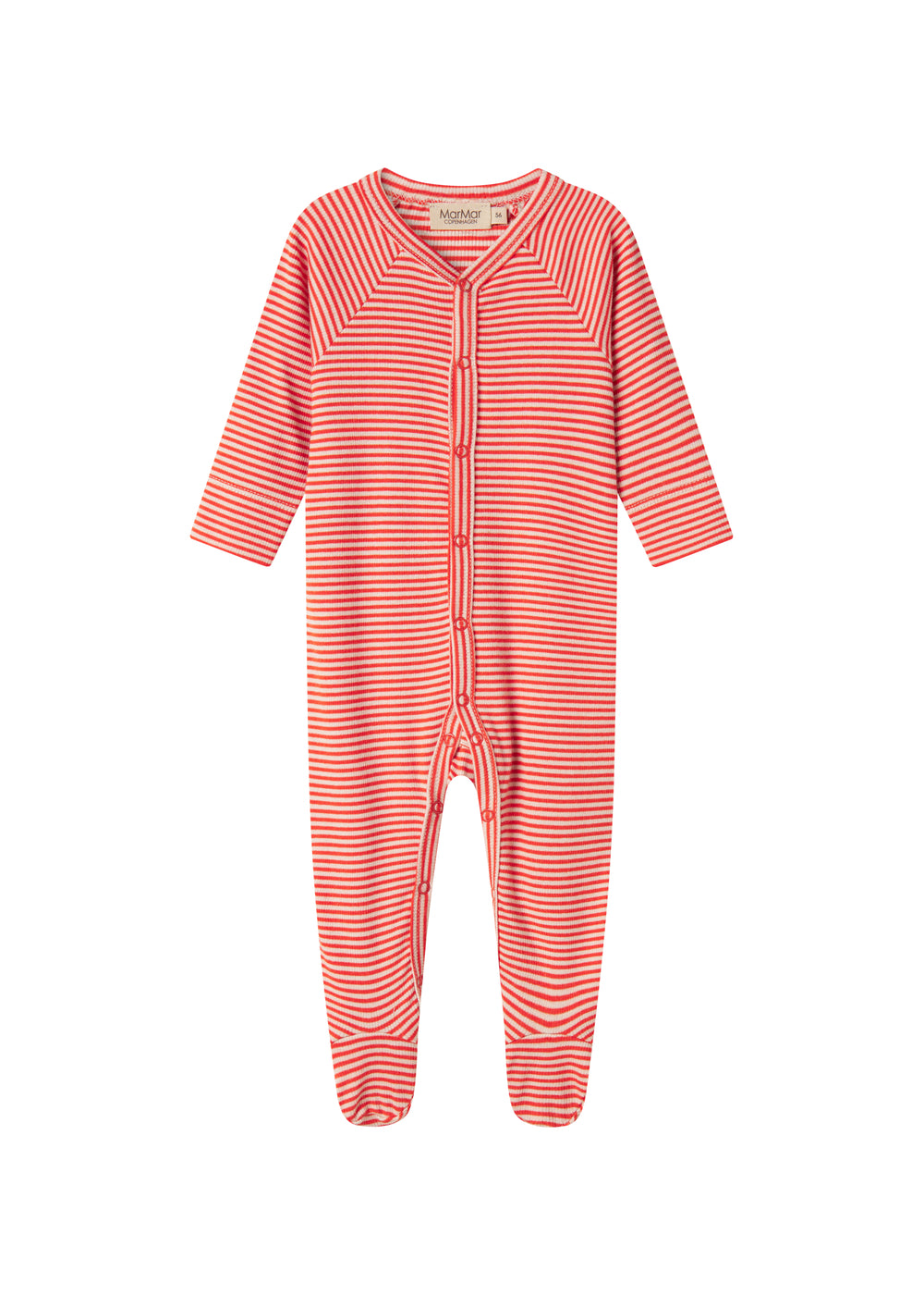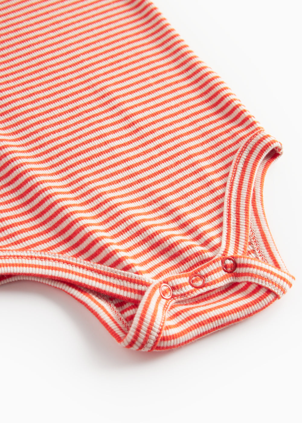 Simple long-sleeved onesie with feet and fine stripes that can be buttoned all the way from the neck down both legs with snaps for easy diaper changes. The onesie is soft, holds its shape and color and has elastane in it, which makes it stretchy and comfortable to wear.