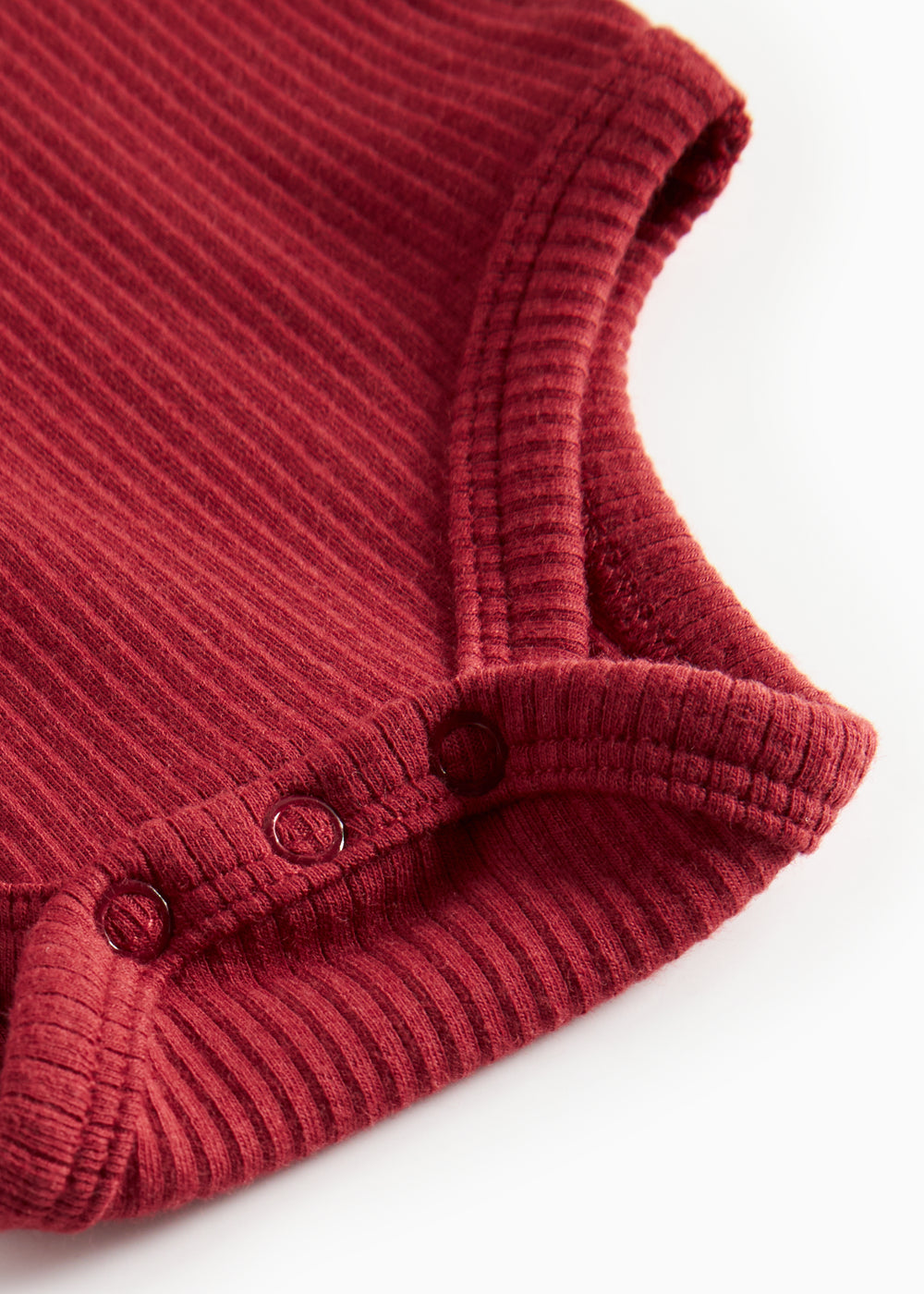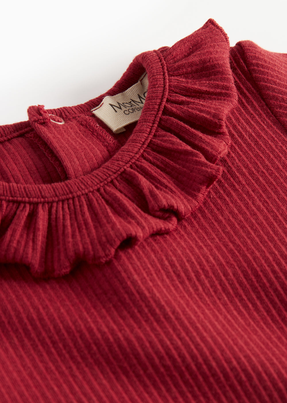 Rød ribbet body med lange ærmer og flæsekrave til baby