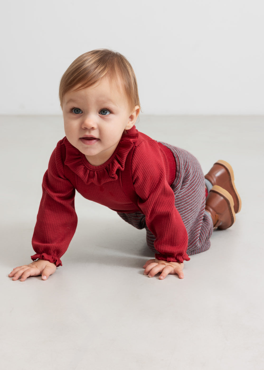 Baby i rød ribbet body med flæsekrave og strikkede bukser