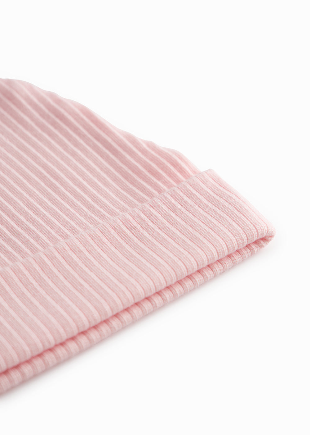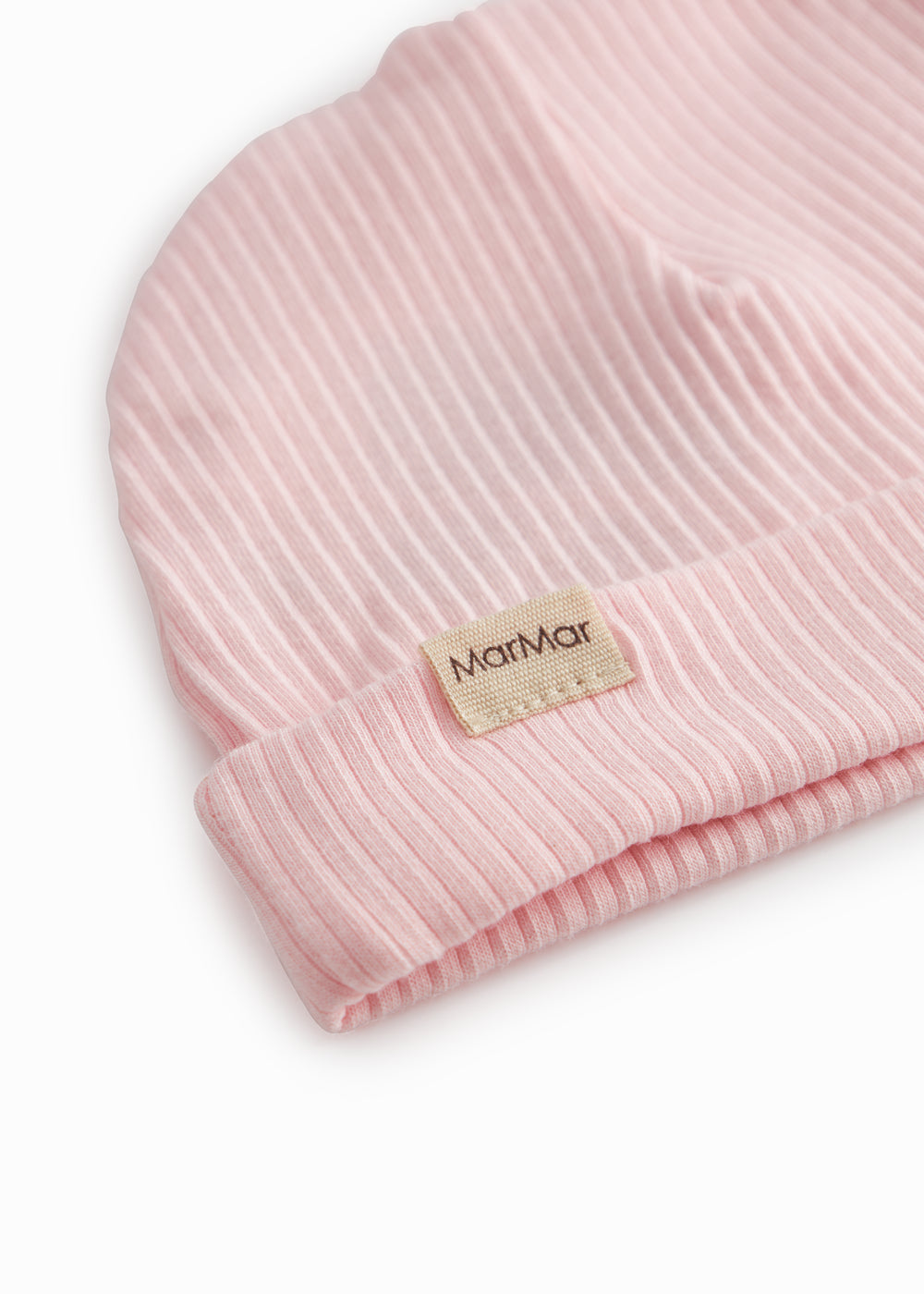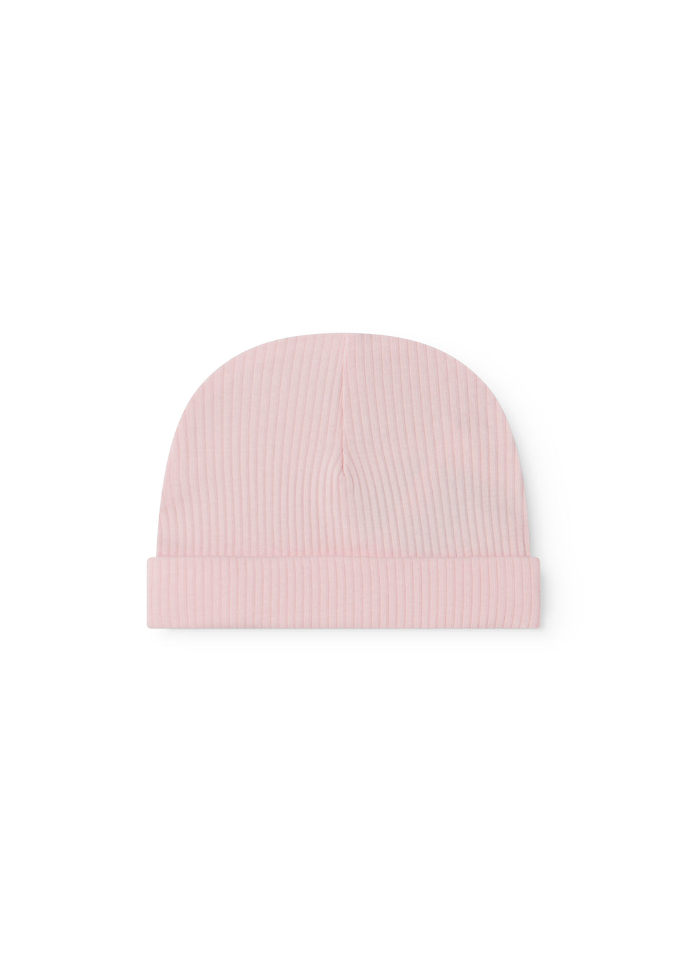 Small hat for newborns with a brim that can be folded up or down. The hat is soft, stretchy and comfortable to wear.