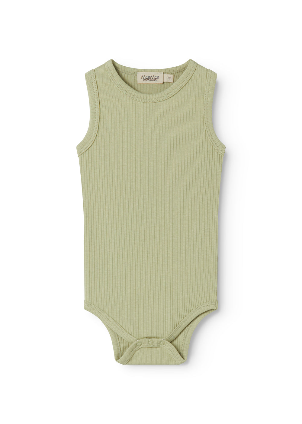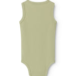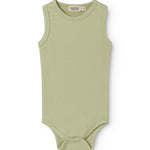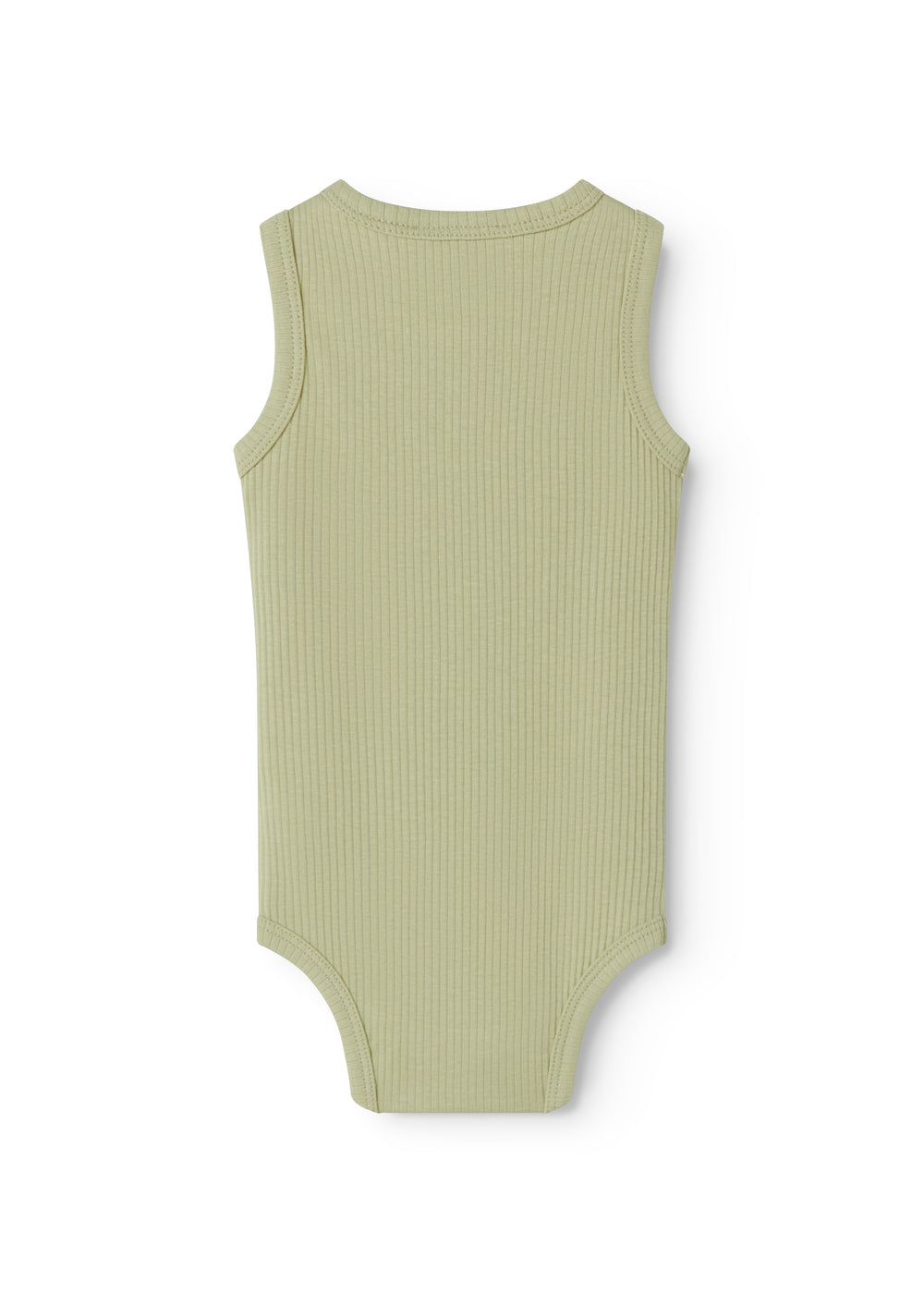 Sleeveless bodystocking that closes with snaps between the legs for easy diaper changes. The bodystocking is ribbed, soft, holds its shape and color and has elastane in it, which makes it stretchy and comfortable to wear.