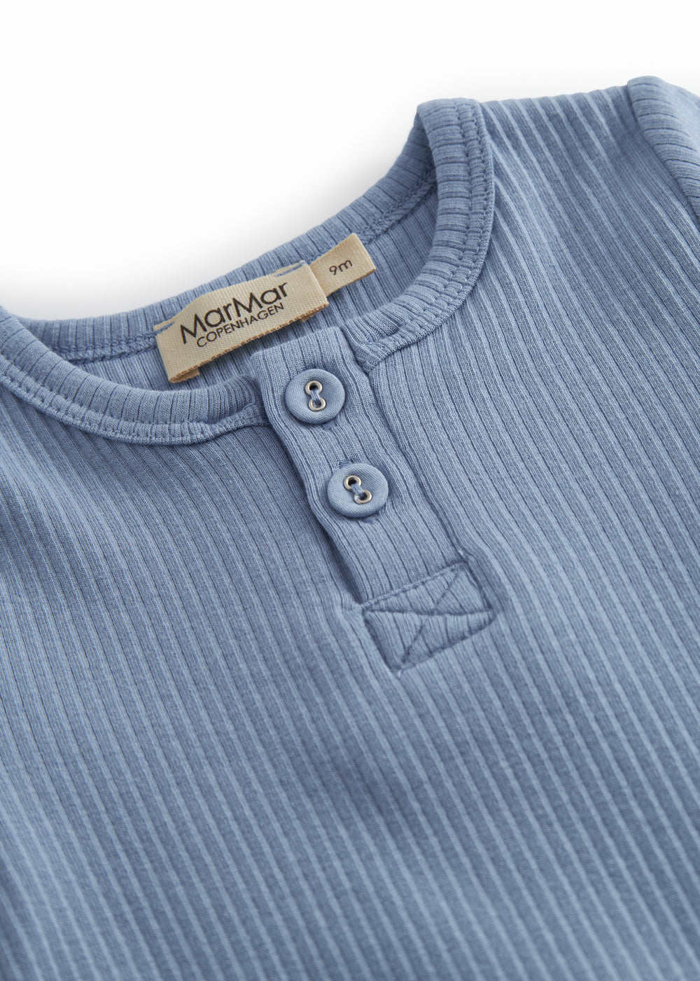 Kortærmet baby modal bodystocking med stolpe knaplukning, der bliver lukket med trykknapper mellem benene for nem bleskiftning. Bodystockingen er både ribstrikket, blød, holder form og farve og har elastan i sig som gør den strækbar og behagelig at have på.