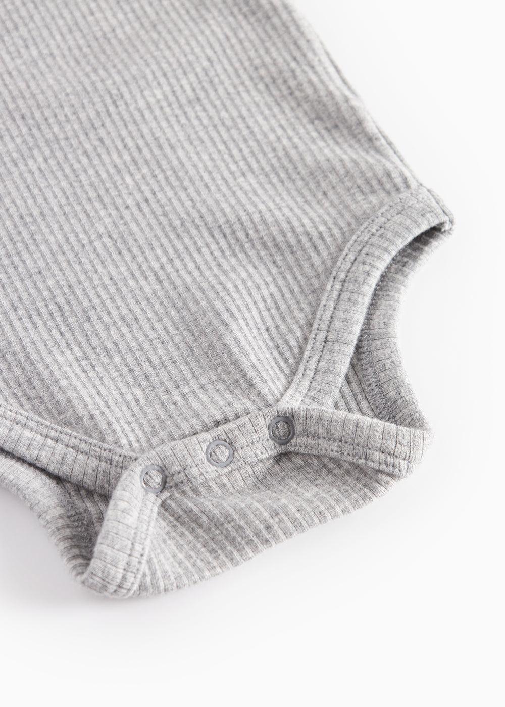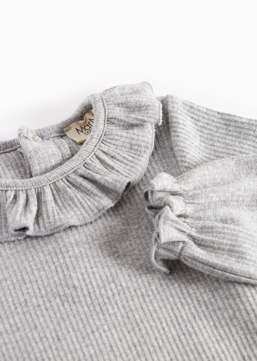Long-sleeved baby bodystocking with a ruffled collar and ruffled edges on the sleeves. The bodystocking is closed at the back with snaps and between the legs for easy diaper changes. The bodystocking is ribbed, soft, holds its shape and color and has elastane in it, which makes it stretchy and comfortable to wear.