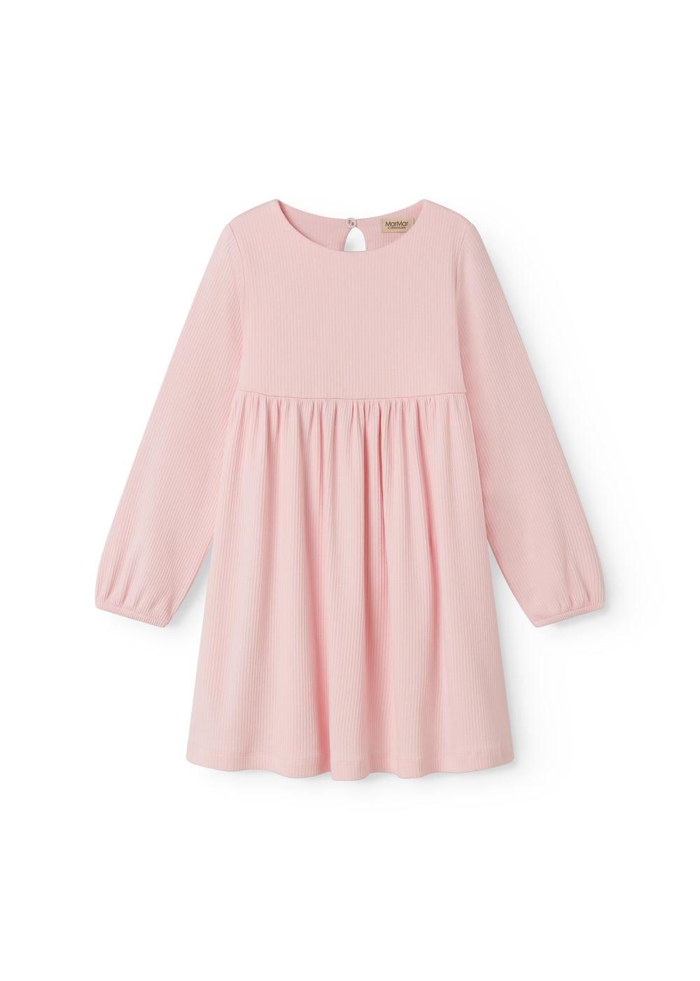 Long-sleeved dress for children. The dress has elastic in the sleeves, button closure at the back and a beautiful skirt. The dress is ribbed and is both soft, stretchy and comfortable to wear. The length of the dress goes above the knee.