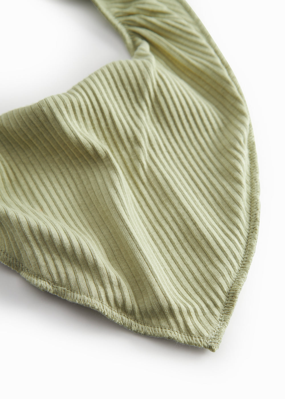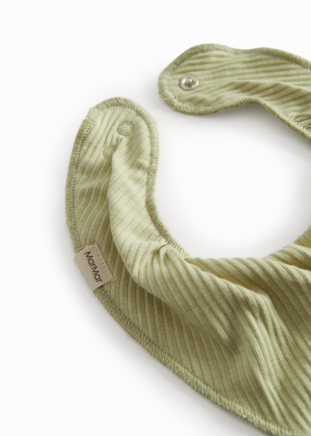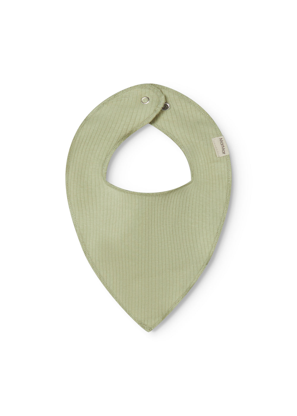 Drool bib that closes with a snap button in two different lengths. The drool bib is sewn in a double layer of fabric. The drool bib is ribbed, soft, holds its shape and color and has elastane in it which makes it stretchy and comfortable to wear.