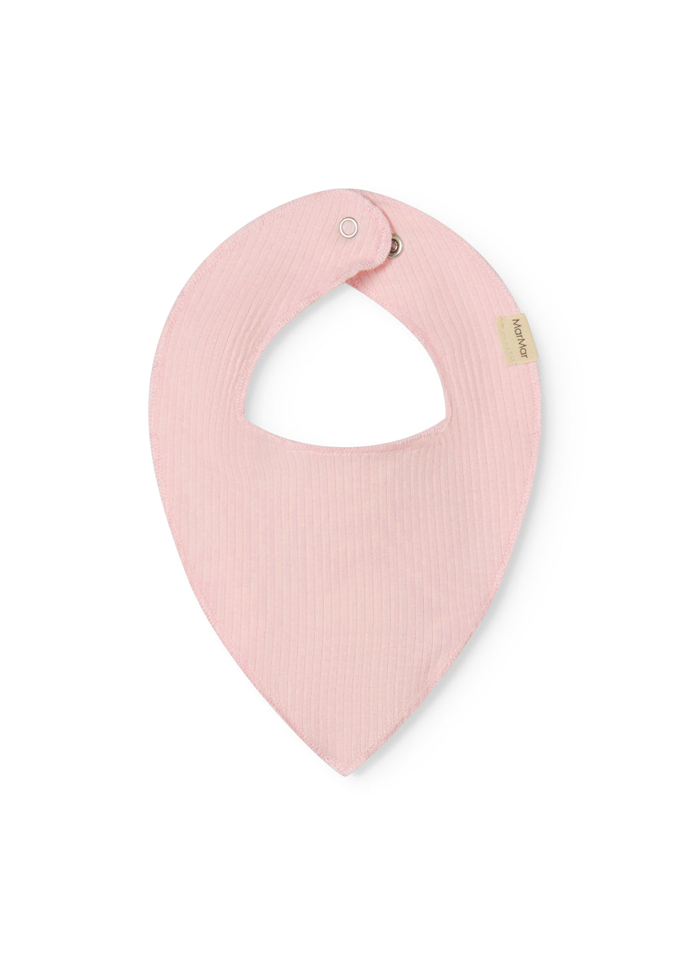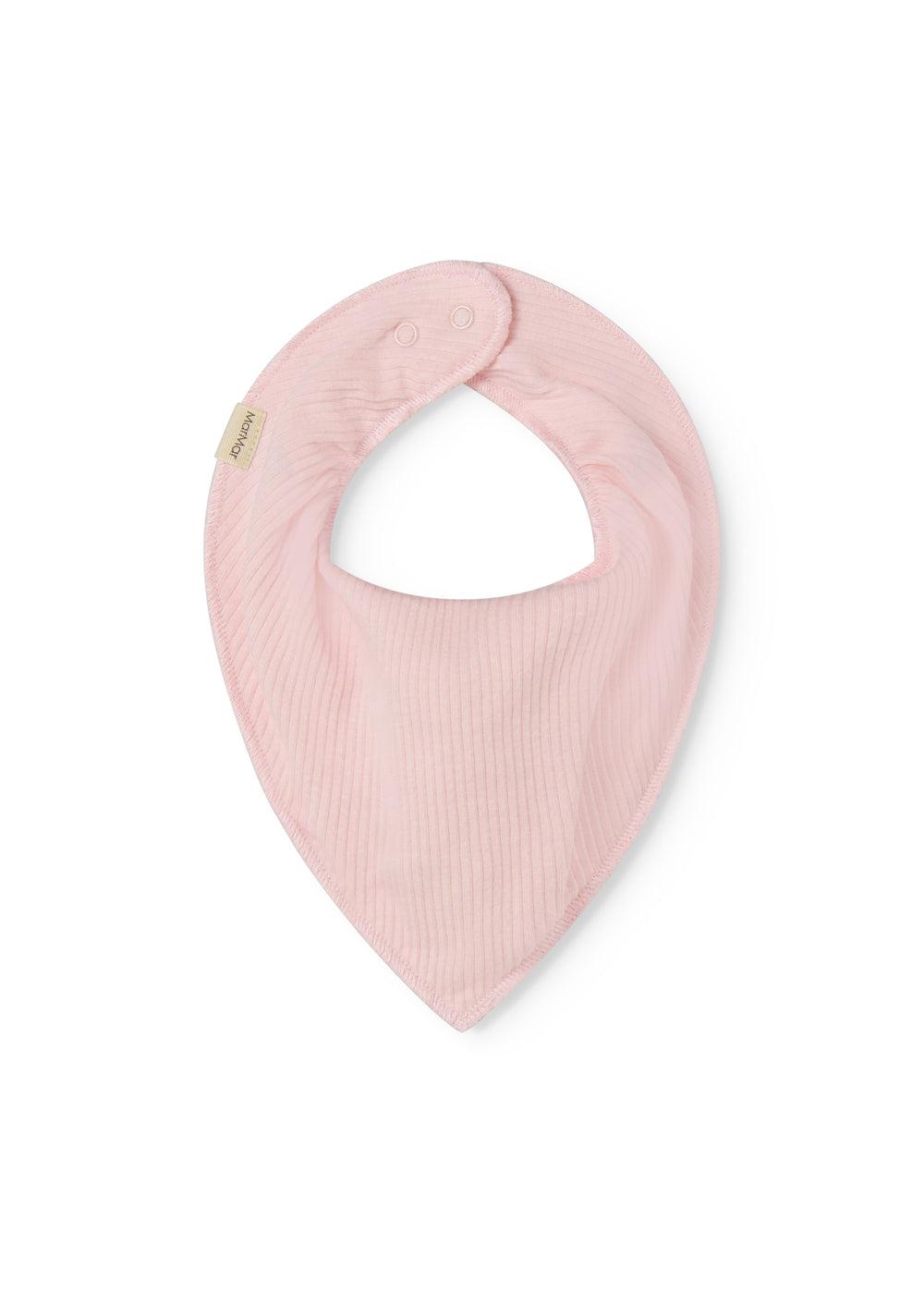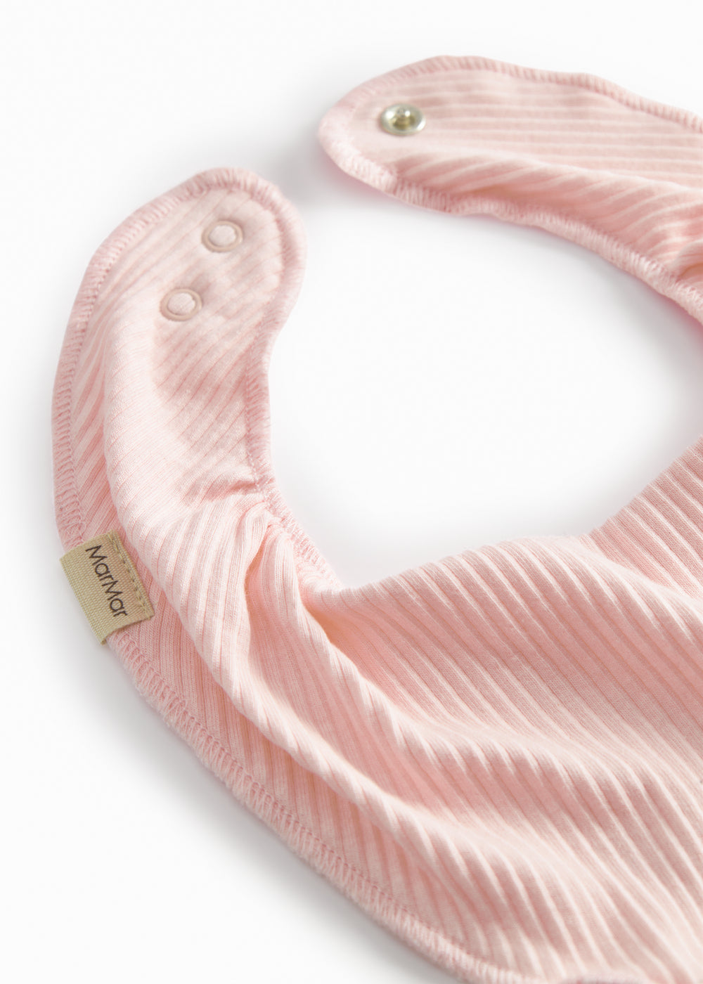 Drool bib that closes with a snap button in two different lengths. The drool bib is sewn in a double layer of fabric. The drool bib is ribbed, soft, holds its shape and color and has elastane in it which makes it stretchy and comfortable to wear.