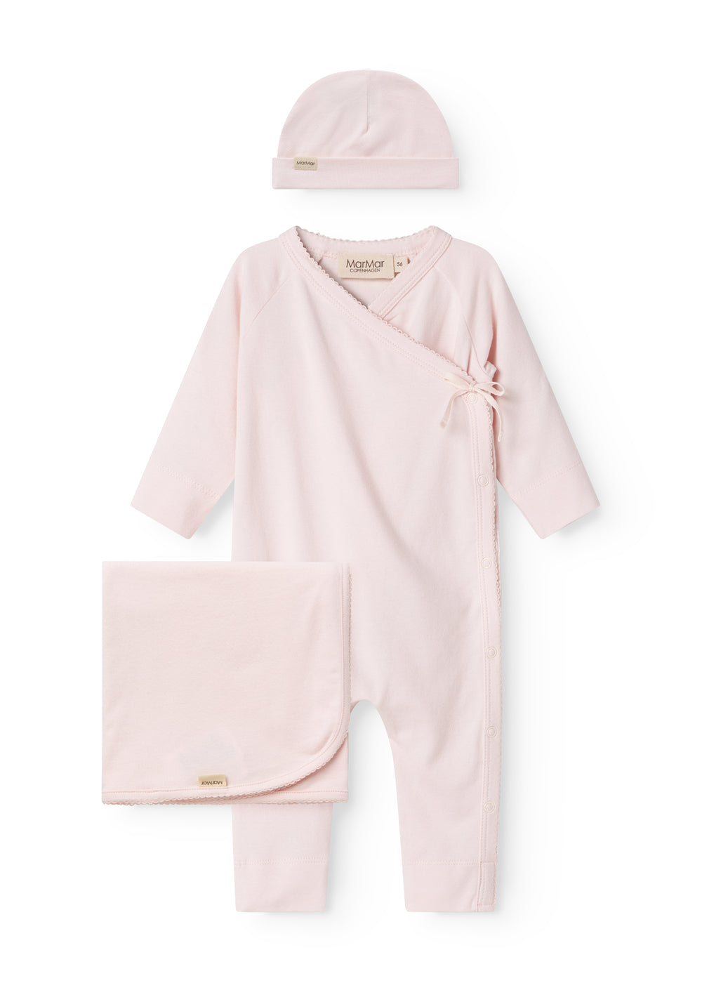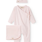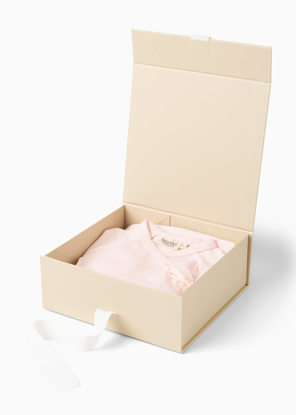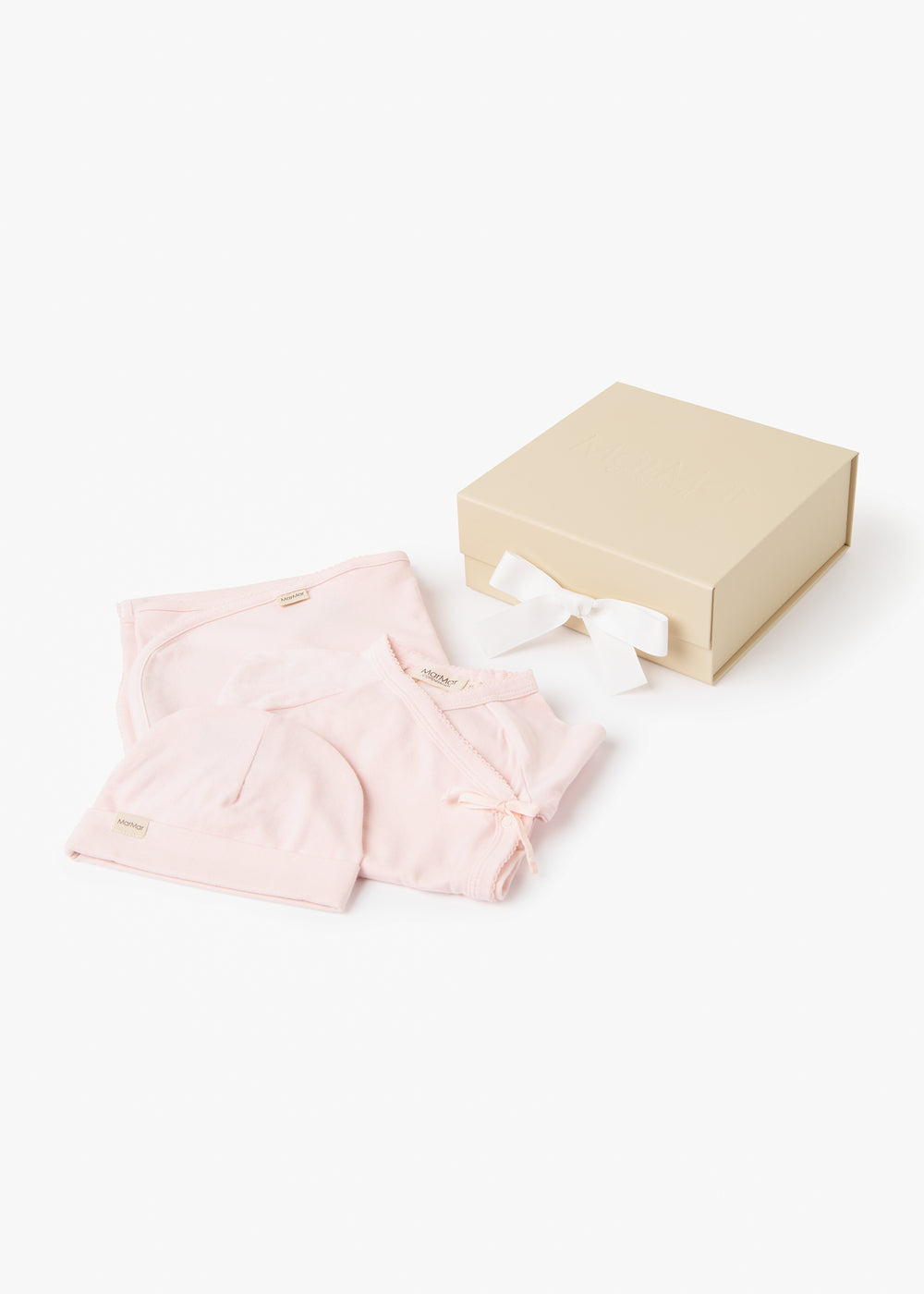 Gift box containing a newborn set consisting of a jumpsuit, hat and baby blanket.