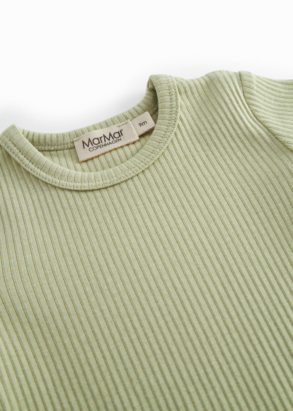 Enkel kortærmet modal bodystocking, der bliver lukket med trykknapper mellem benene for nem bleskiftning. Bodystockingen er ribstrikket, blød, holder form og farve og har elastan i sig som gør den strækbar og behagelig at have på.
