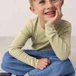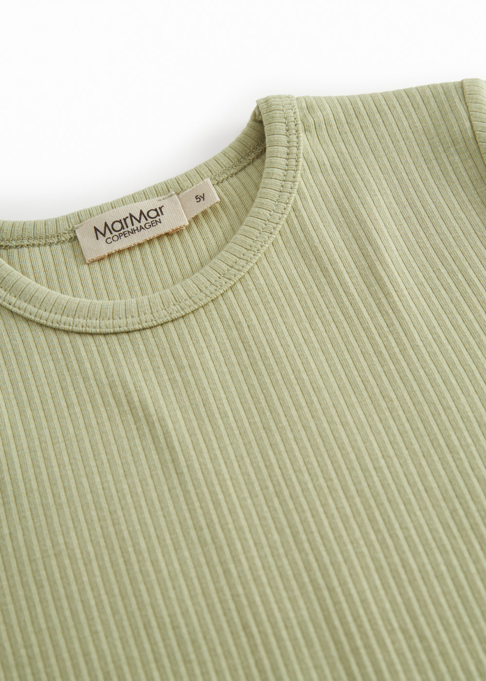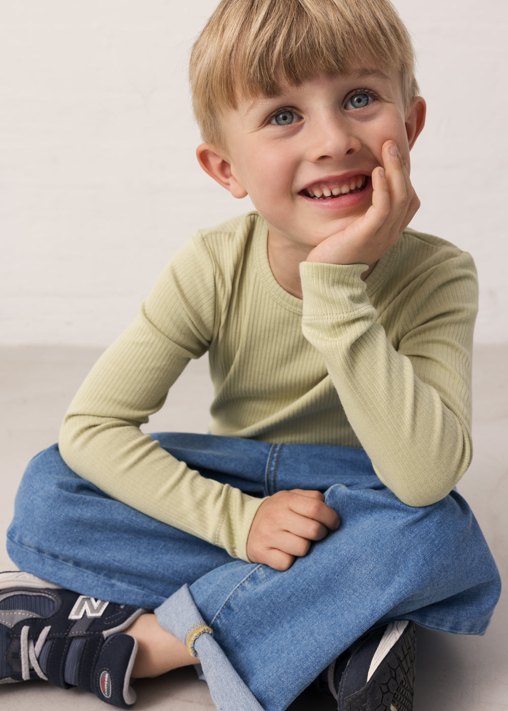 Simple long-sleeved modal t-shirt. The t-shirt is ribbed, soft, holds its shape and color and has elastane in it, which makes it stretchy and comfortable to wear.