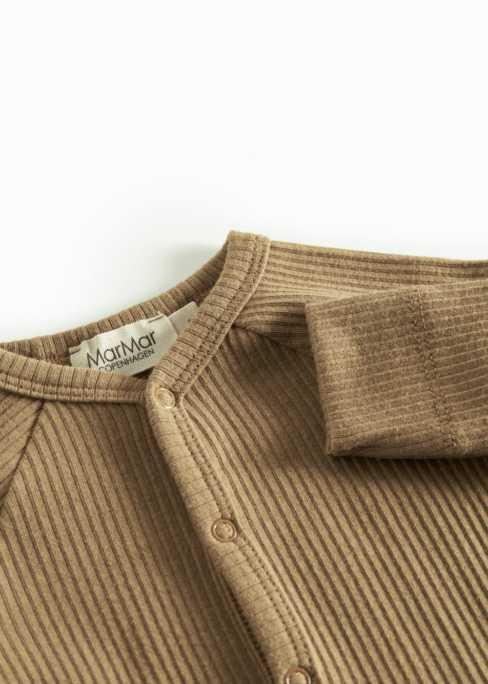 Simple long-sleeved jumpsuit that can be buttoned all the way from the neck down both legs with snaps for easy diaper changes. The jumpsuit is soft, holds its shape and color and has elastane in it, which makes it stretchy and comfortable to wear.