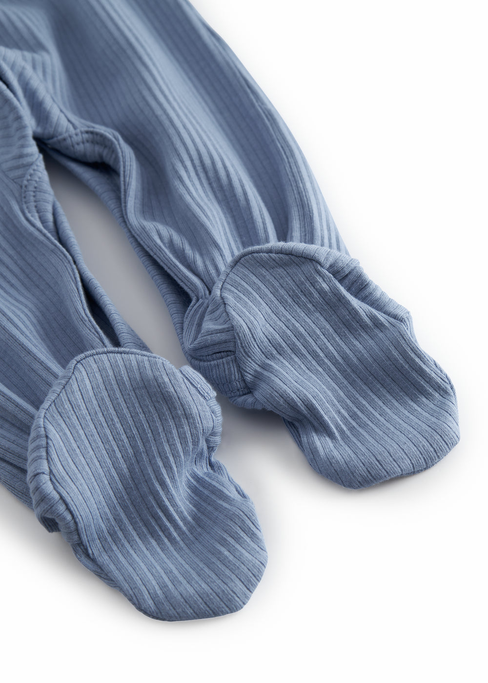 Simple long-sleeved jumpsuit with feet that can be buttoned all the way from the neck down both legs with snaps for easy diaper changes. The jumpsuit is soft, holds its shape and color and has elastane in it which makes it stretchy and comfortable to wear.
