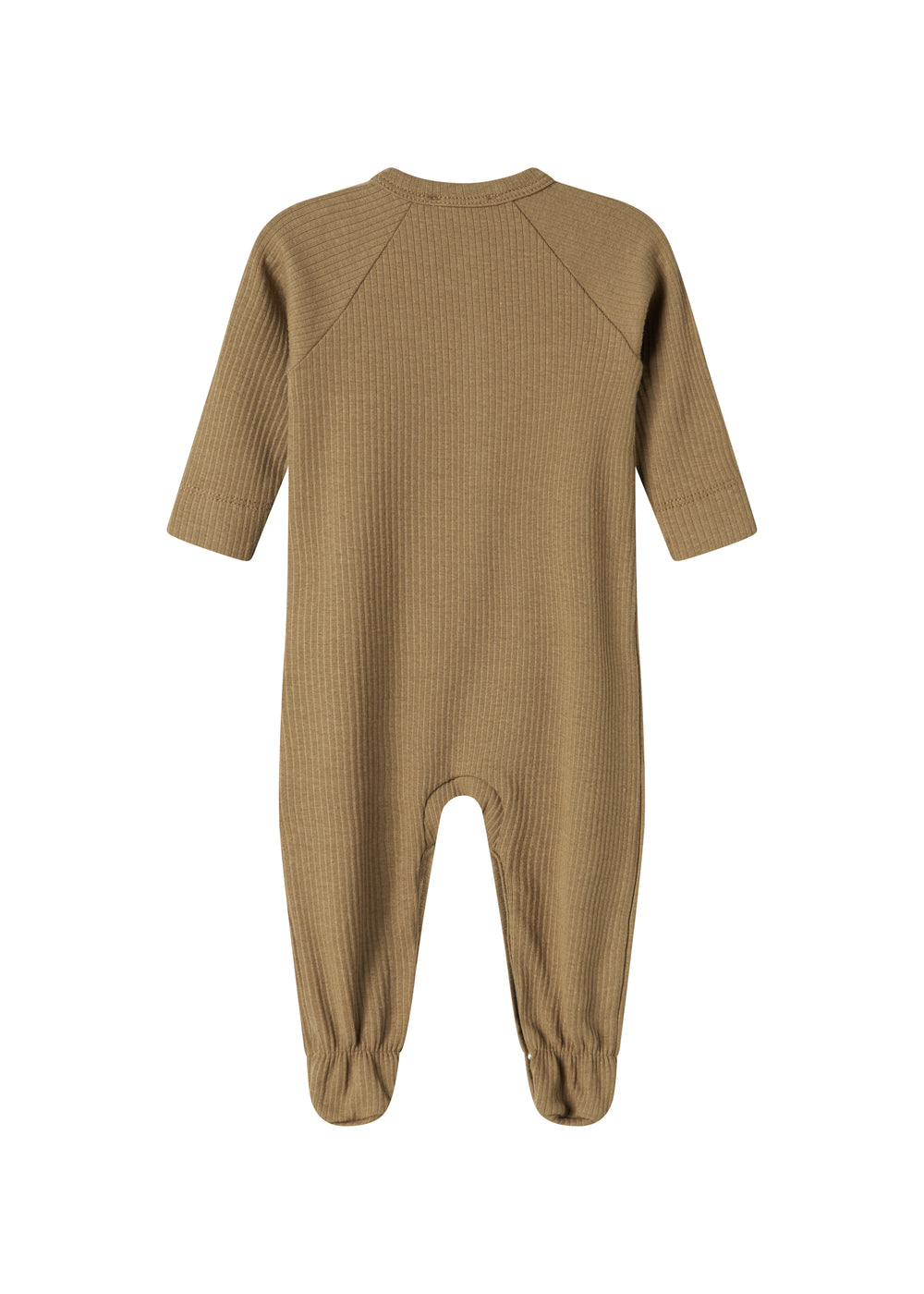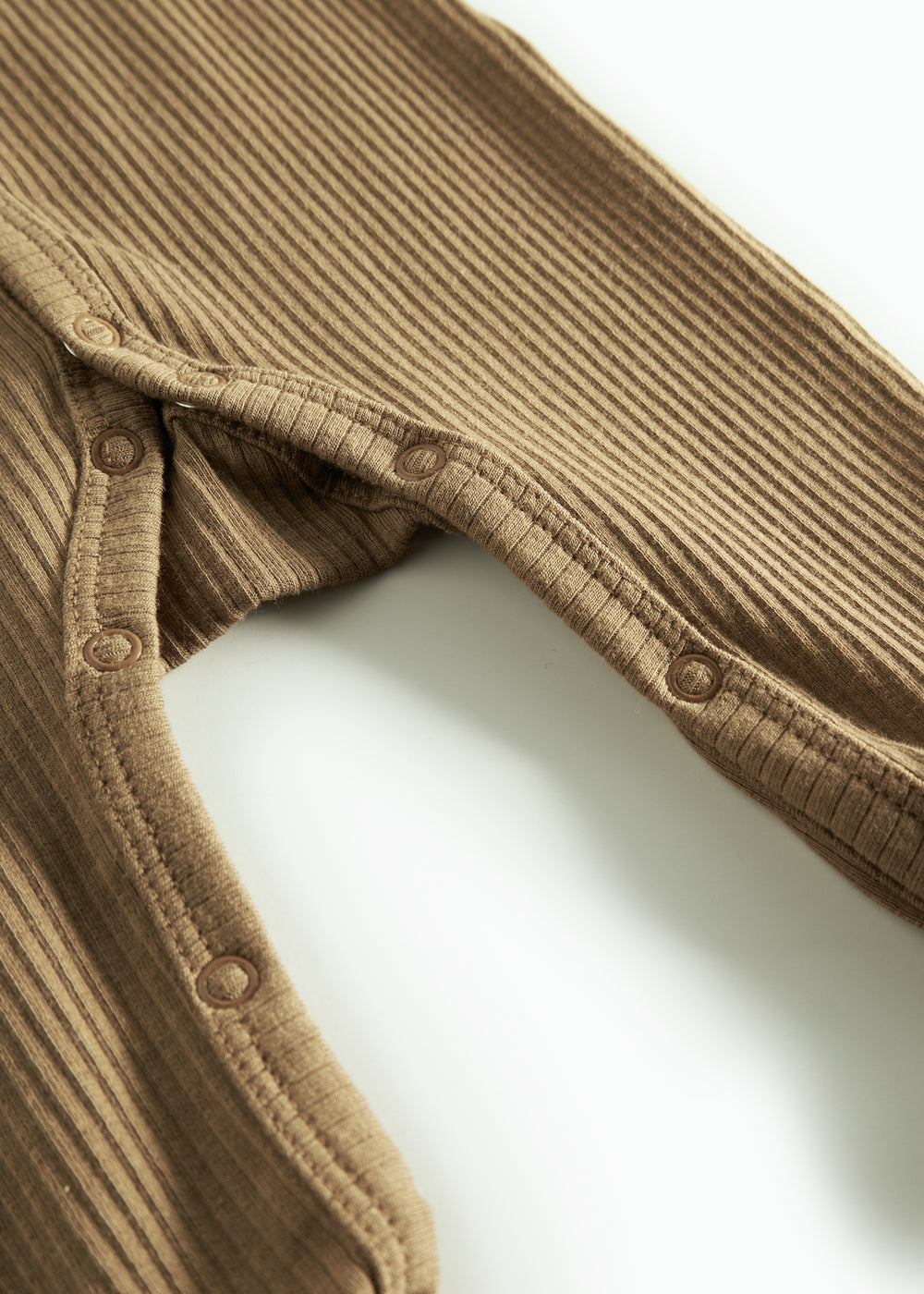 Simple long-sleeved jumpsuit with feet that can be buttoned all the way from the neck down both legs with snaps for easy diaper changes. The jumpsuit is soft, holds its shape and color and has elastane in it which makes it stretchy and comfortable to wear.