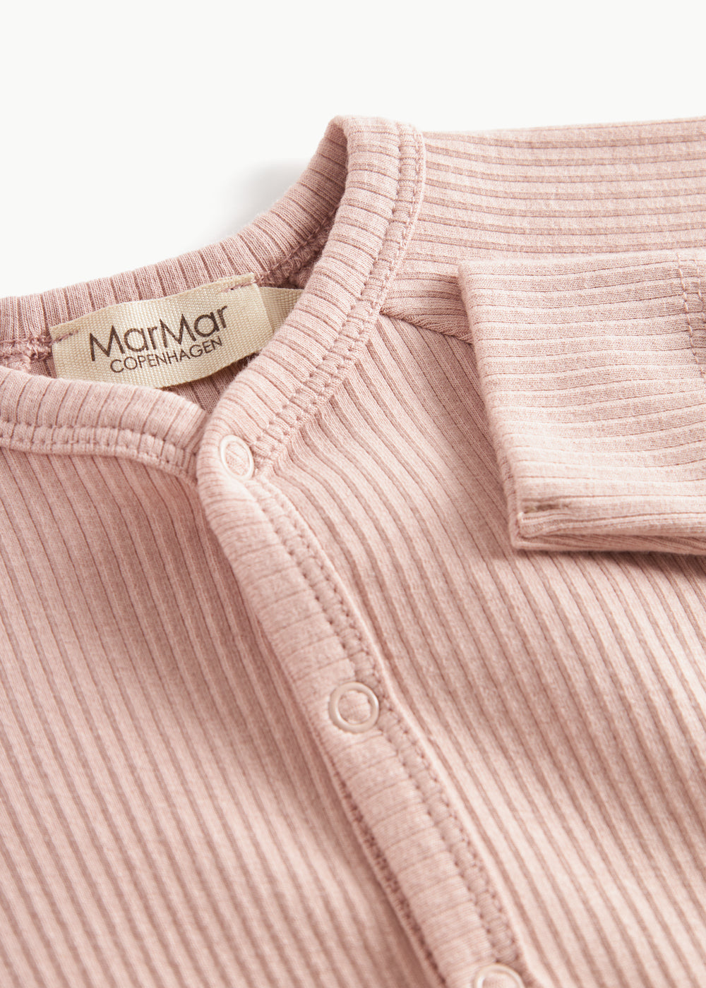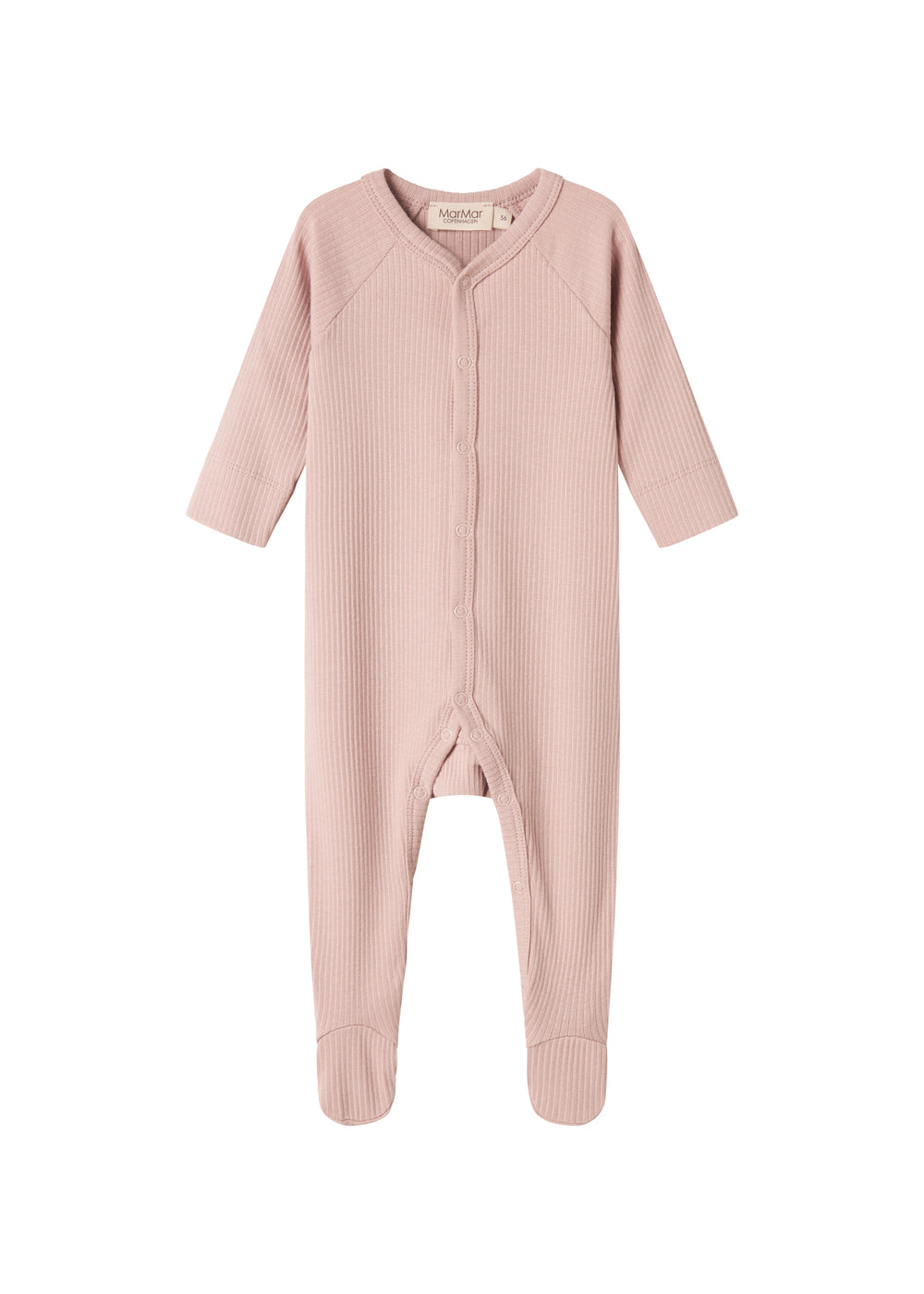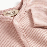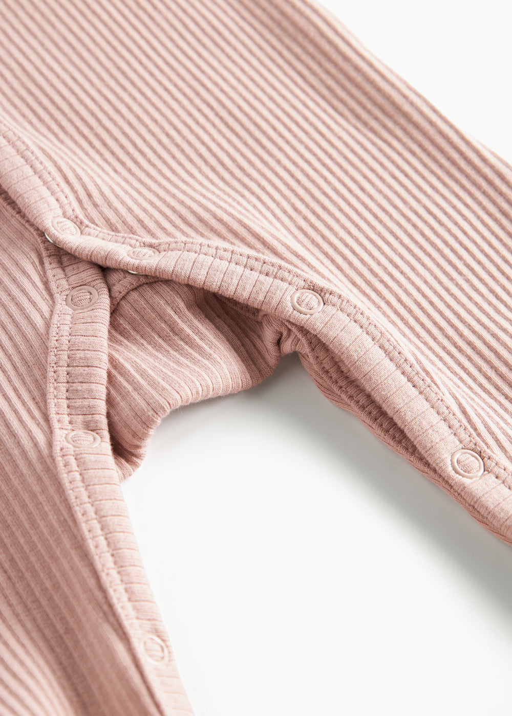ribbstrikket lyserød heldragt til baby i blødt materiale med lange ærmer, lange ben, tryknapper og futter