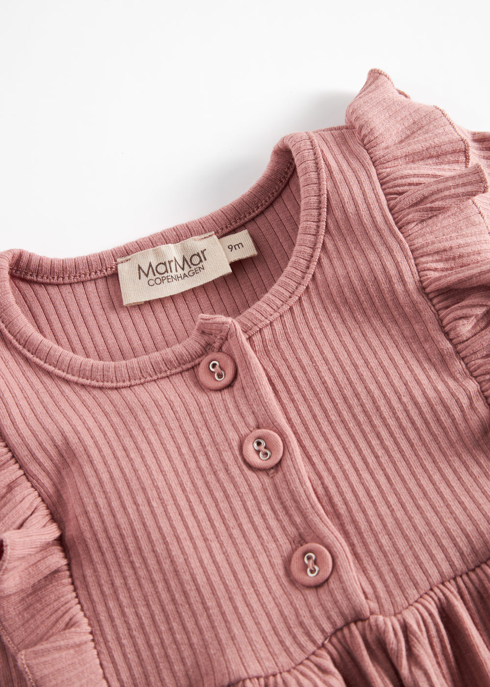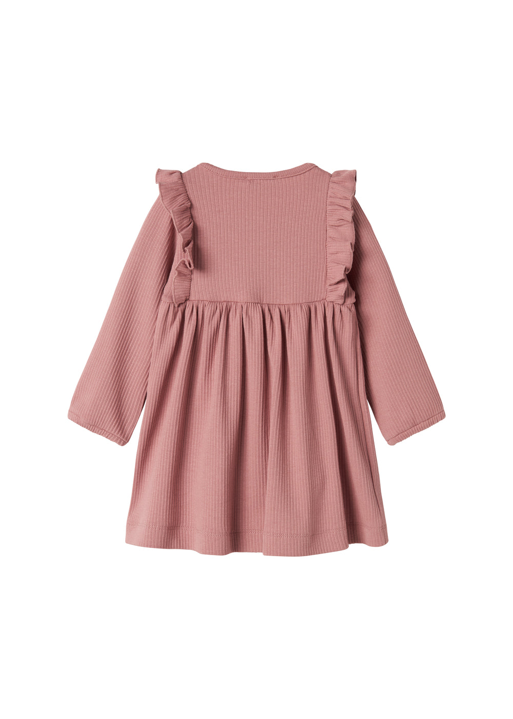 Long-sleeved dress with placket button closure and ruffle details. The length of the dress goes above the knee. The dress is ribbed, soft, stretchy and comfortable to wear.