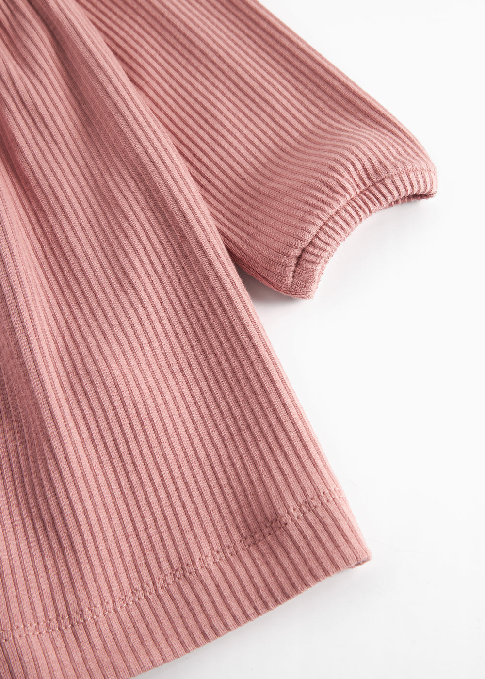 Lyserød ribstrikket kjole med lange ærmer, knapper og flæser til børn