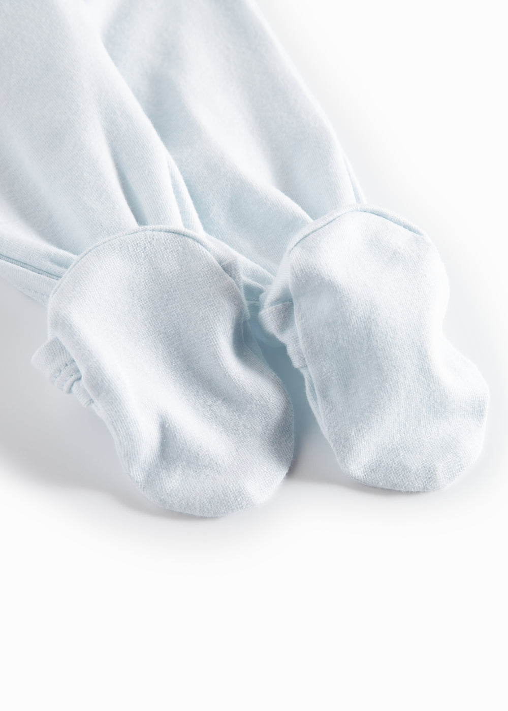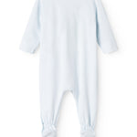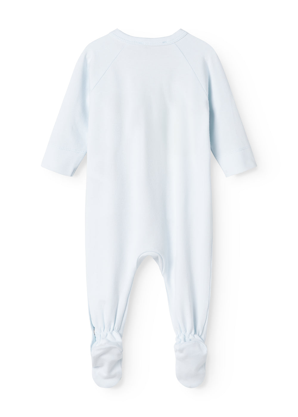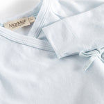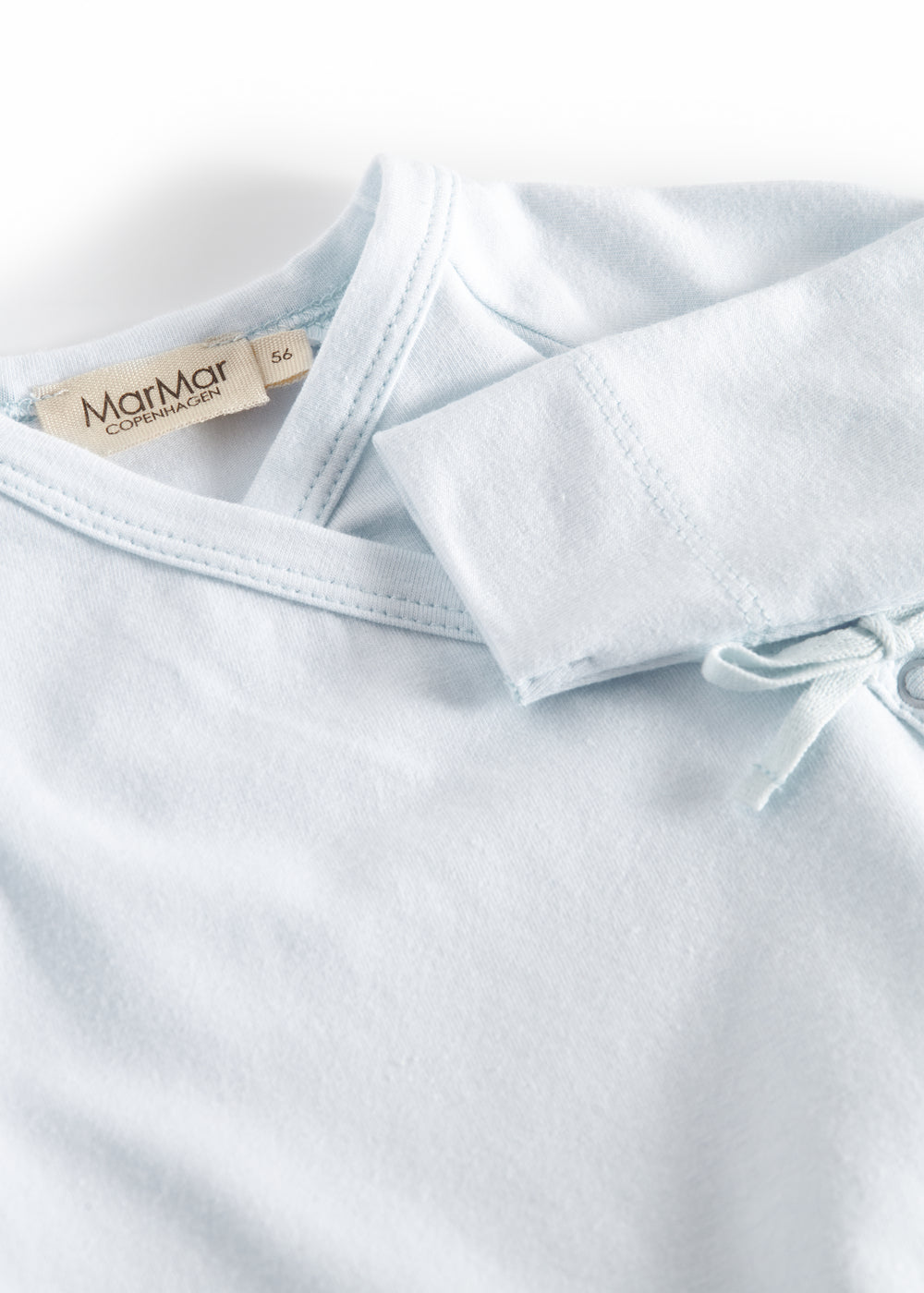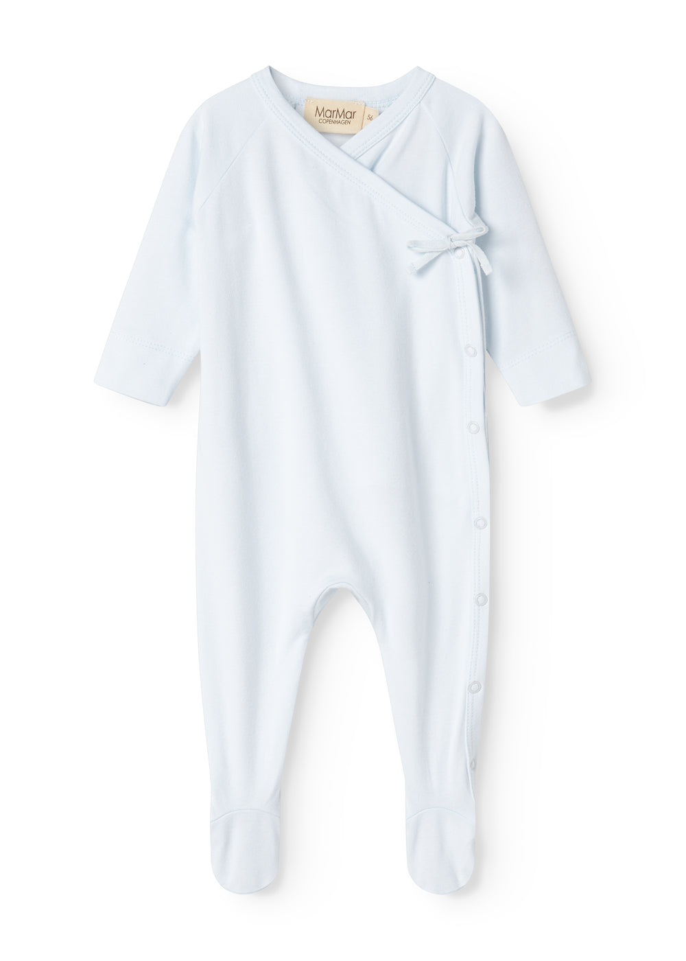 The jumpsuit has a wrap-around closure and closes with snaps and ties from the neck down one leg.