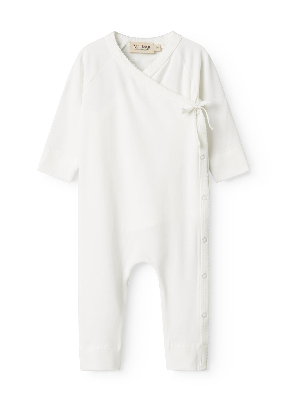 Long-sleeved romper with wrap-around closure, the jumpsuit closes with snaps and ties from the neck down one leg.