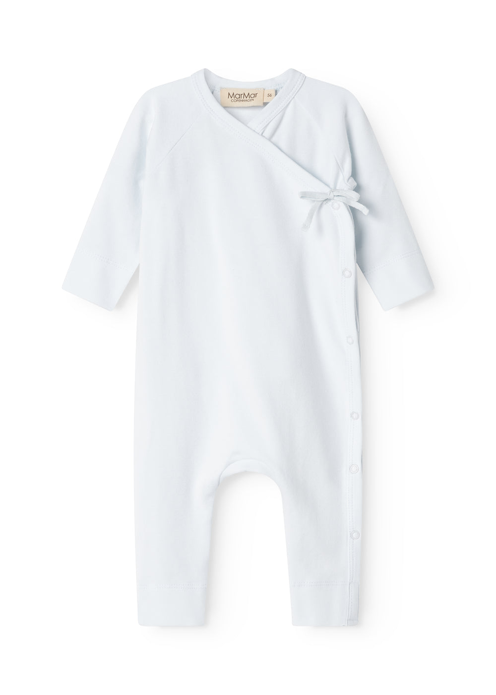 Long-sleeved jumpsuit with wrap-around closure, the jumpsuit closes with snaps and ties from the neck down one leg.