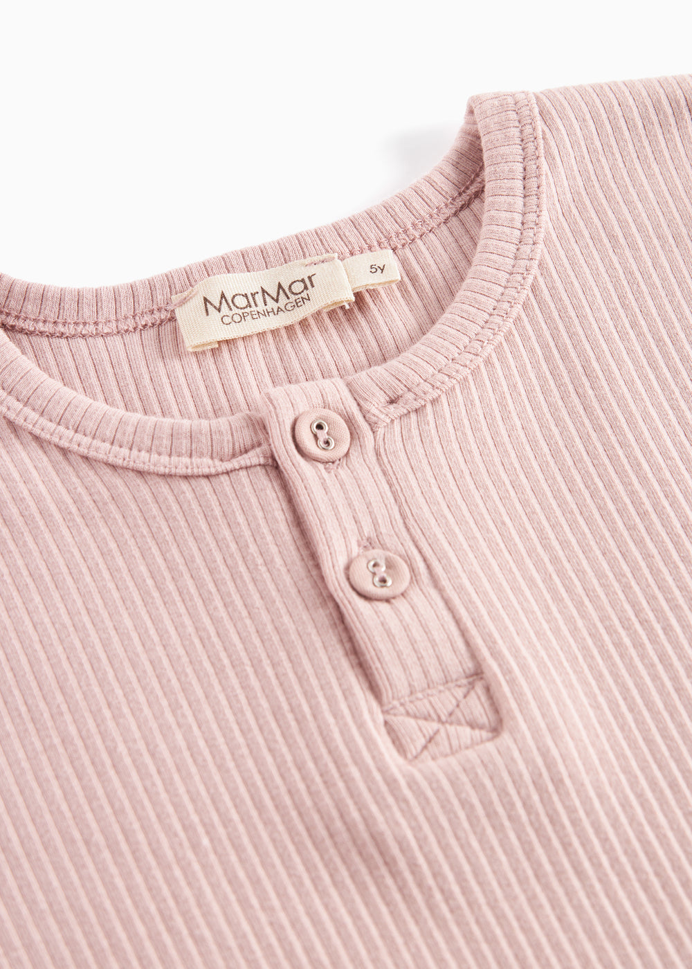 Long-sleeved t-shirt for children with placket button closure. The t-shirt is ribbed, soft, stretchy and comfortable to wear.