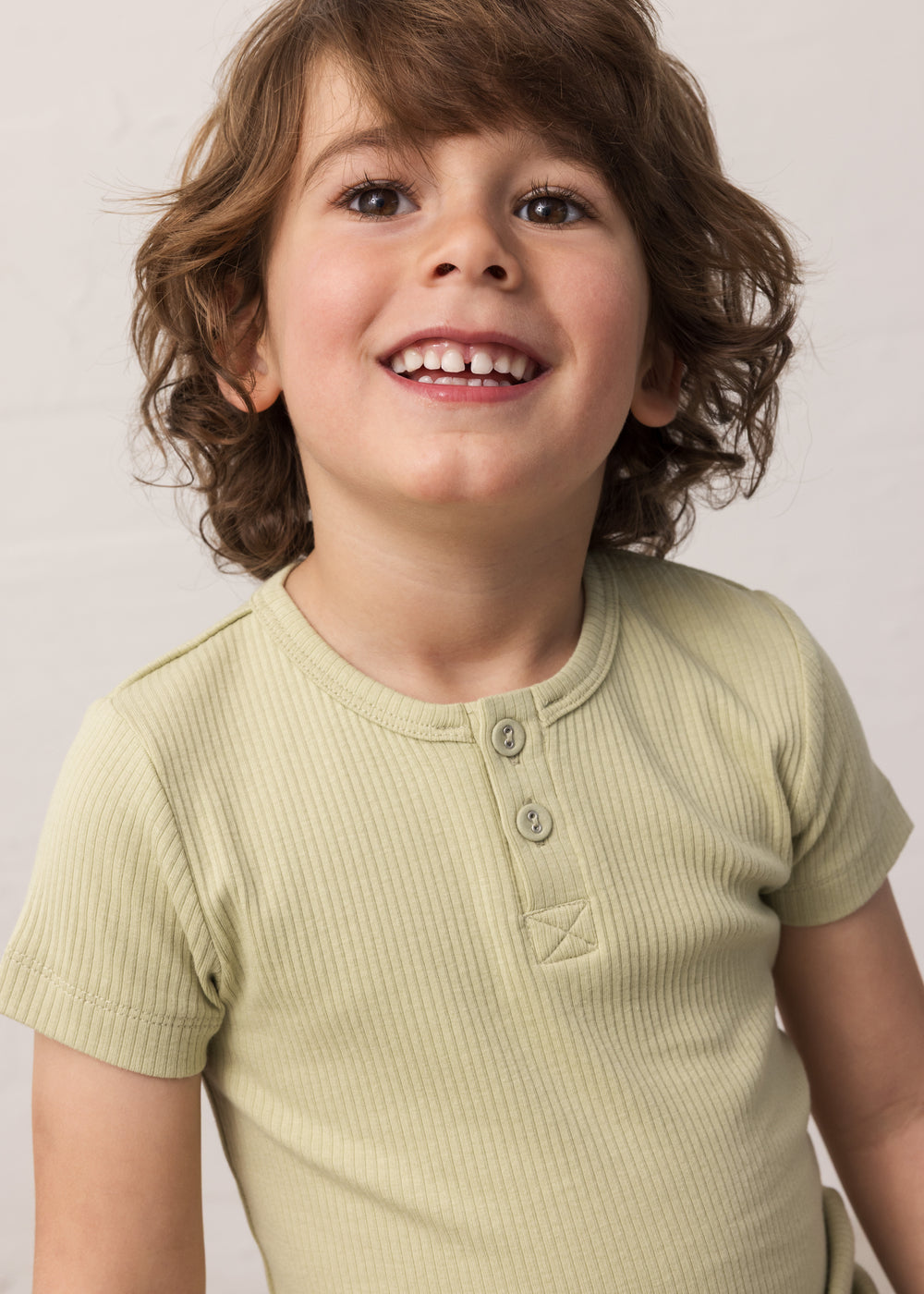 Short-sleeved modal t-shirt for children with placket button closure. The t-shirt is ribbed, soft, holds its shape and color and has elastane in it, which makes it stretchy and comfortable to wear.