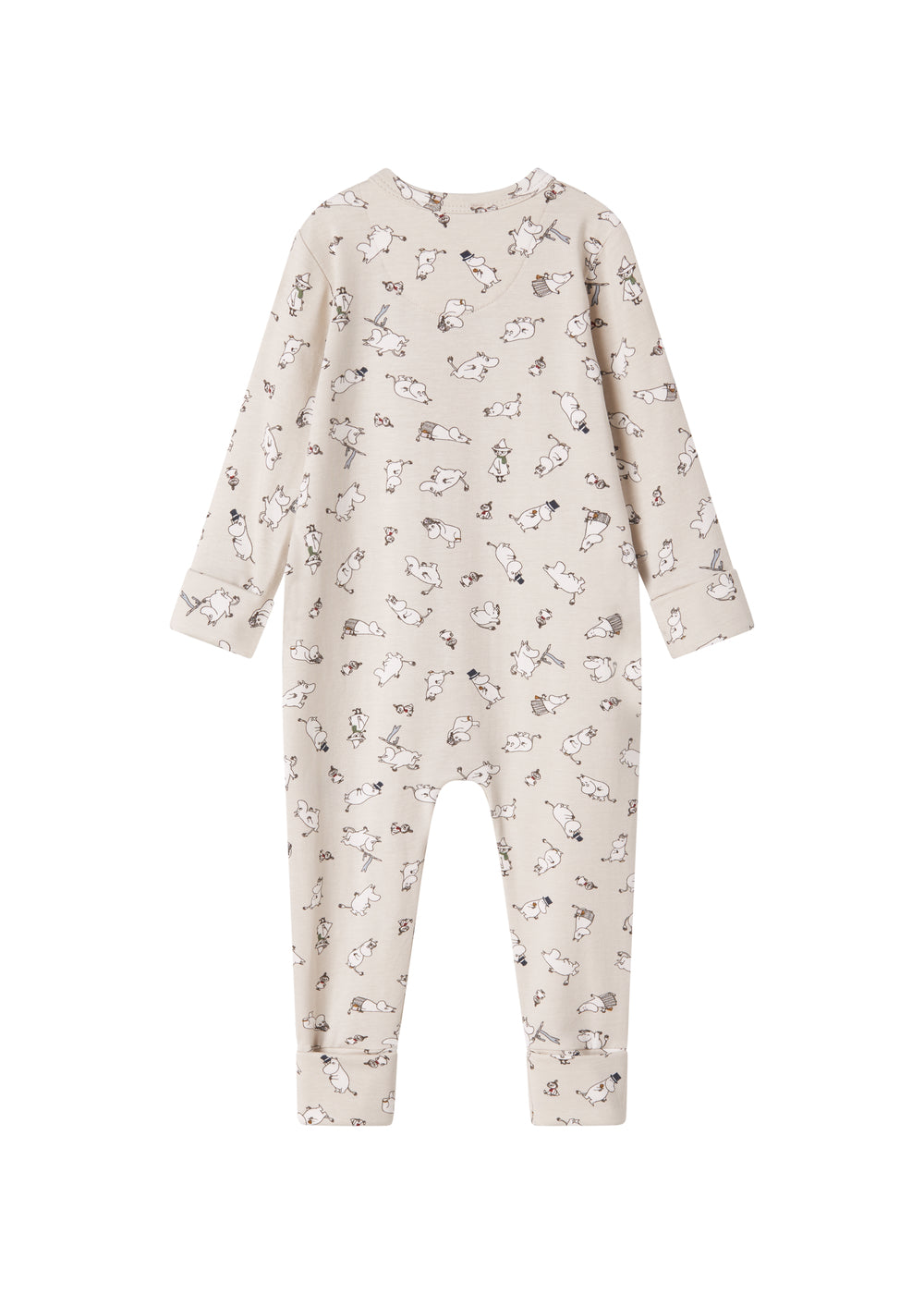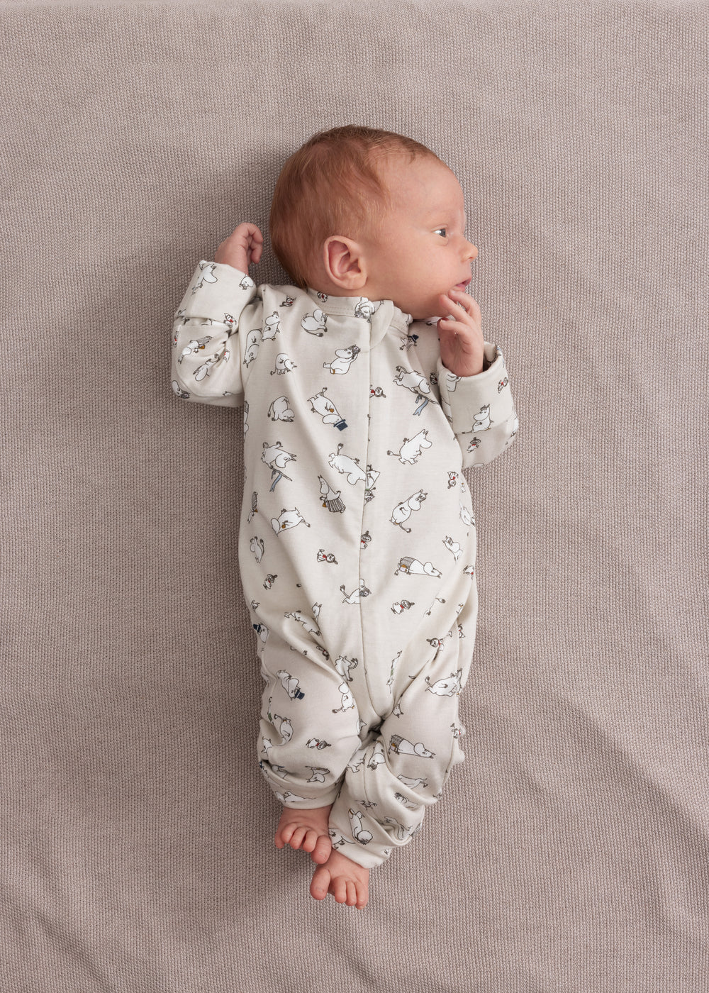 Simple long-sleeved jumpsuit with a cute Moomin print that can be zipped all the way from the neck down one leg for easy diaper changes. The jumpsuit has pleats at both sleeves and legs, which can be adjusted as the child grows. The jumpsuit also has a foldable mitten/stocking function from size 2-4M. The jumpsuit is soft, holds its shape and color and has elastane in it, which makes it stretchy and comfortable to wear.