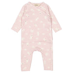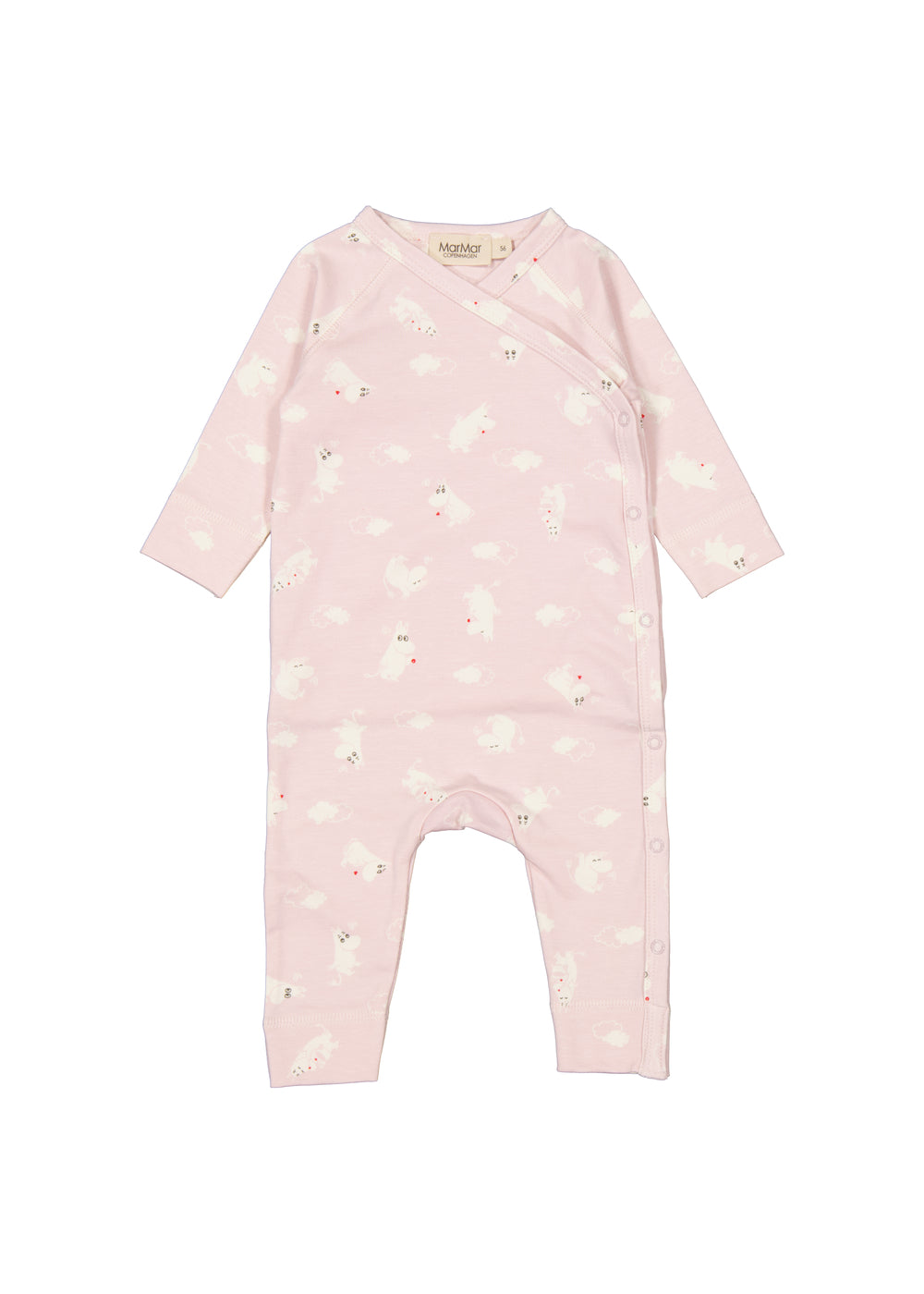 Long-sleeved jumpsuit with wrap-around closure for newborns. The jumpsuit has a nice Moomin print. The jumpsuit closes with press studs from the neck and down one leg and is soft, stretchy and comfortable to wear.