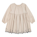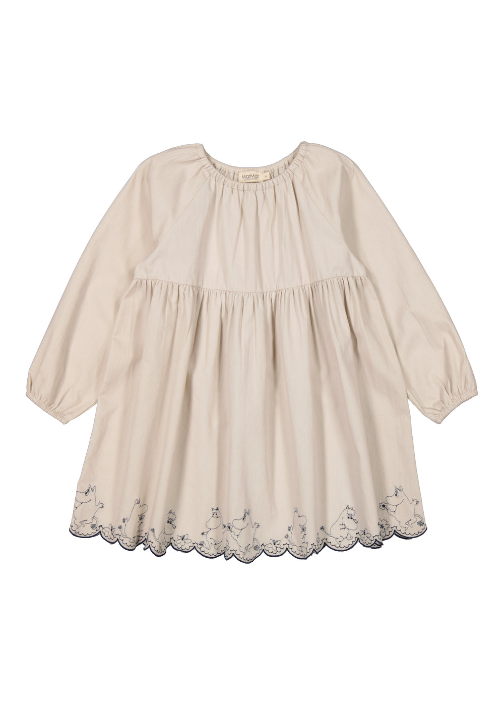 Long-sleeved dress with good volume. The dress has fine wavy edges and embroidered Moomin details at the bottom. The length of the dress goes above the knee.