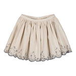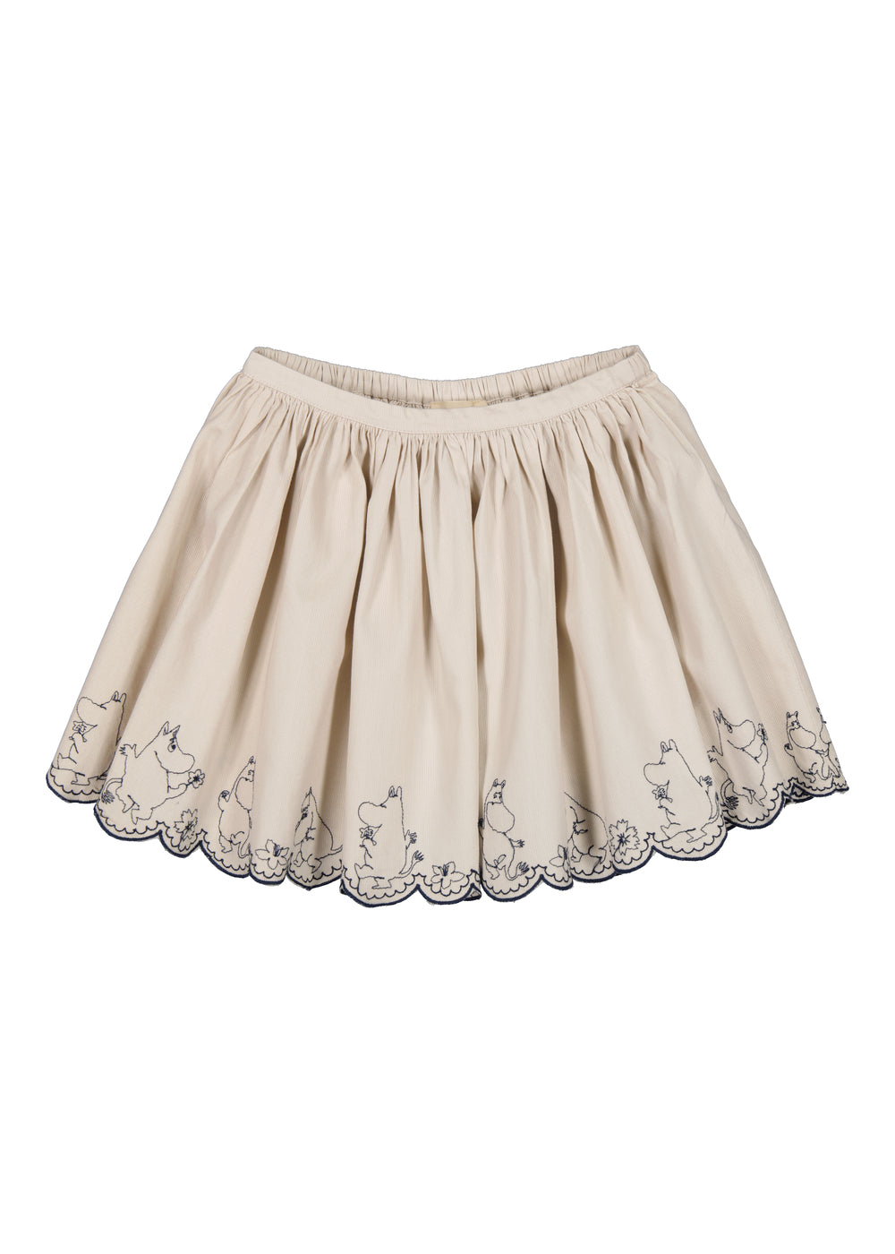 Skirt with elastic waist and fine hooped edges with embroidered Moomin details at the bottom. The length of the skirt goes above the knee.