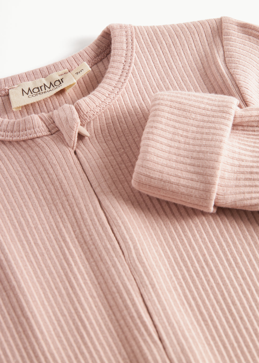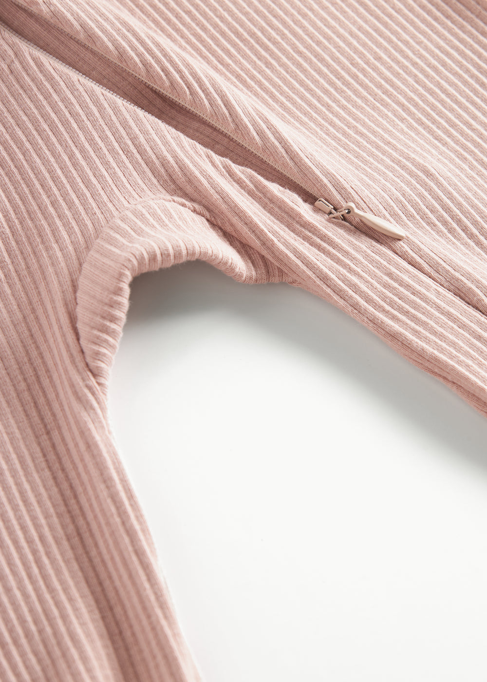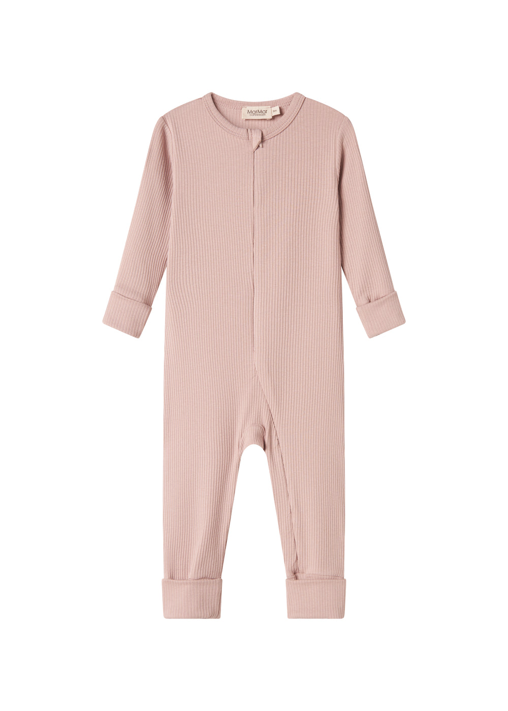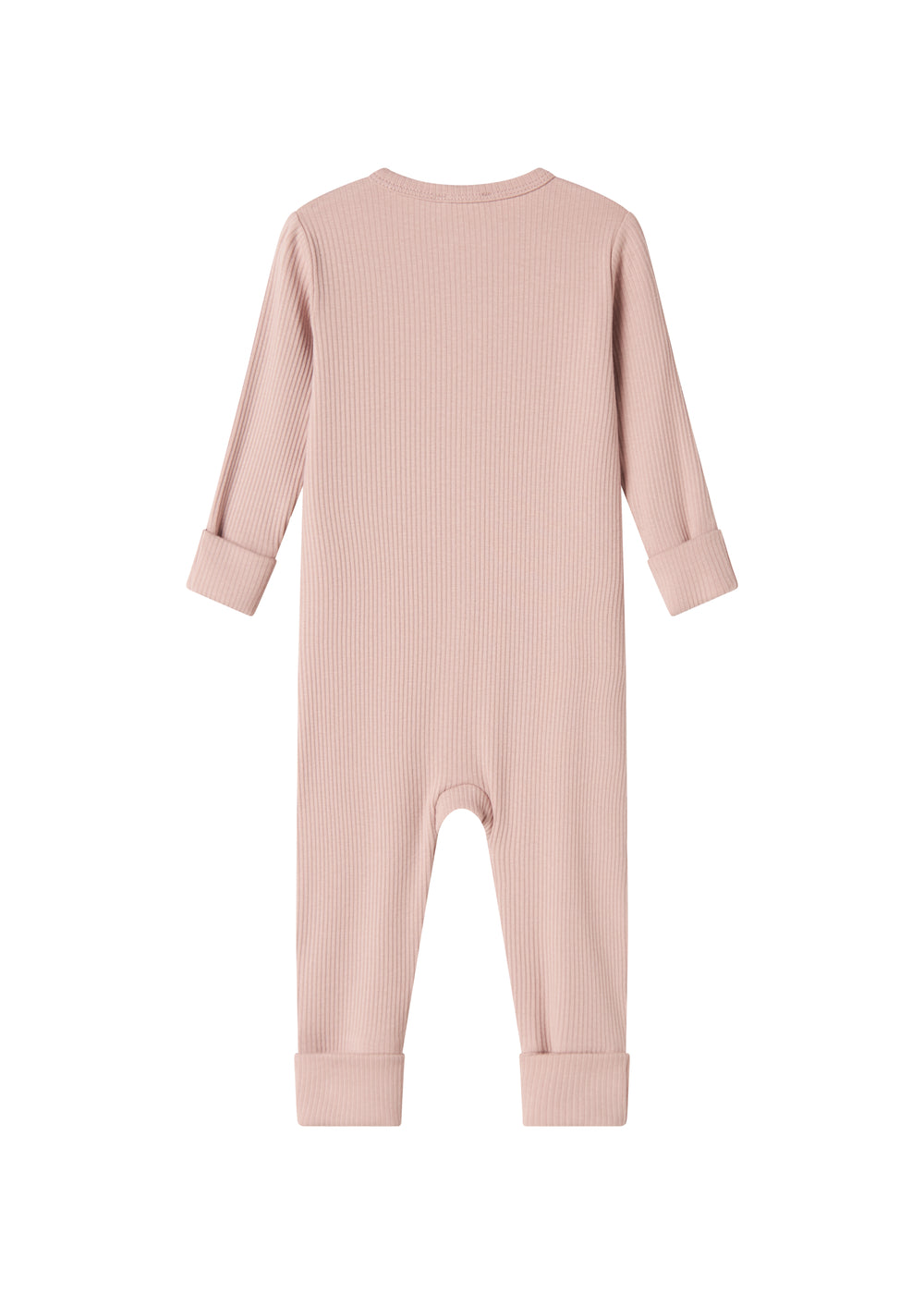 Simple long-sleeved jumpsuit that can be zipped all the way from the neck down one leg with a zipper for easy diaper changes. The jumpsuit has pleats at both sleeves and legs, which can be adjusted as the child grows. The jumpsuit also has a foldable mitten/sock function from size 2-4M. The jumpsuit is ribbed, soft, stretchy and comfortable to wear.