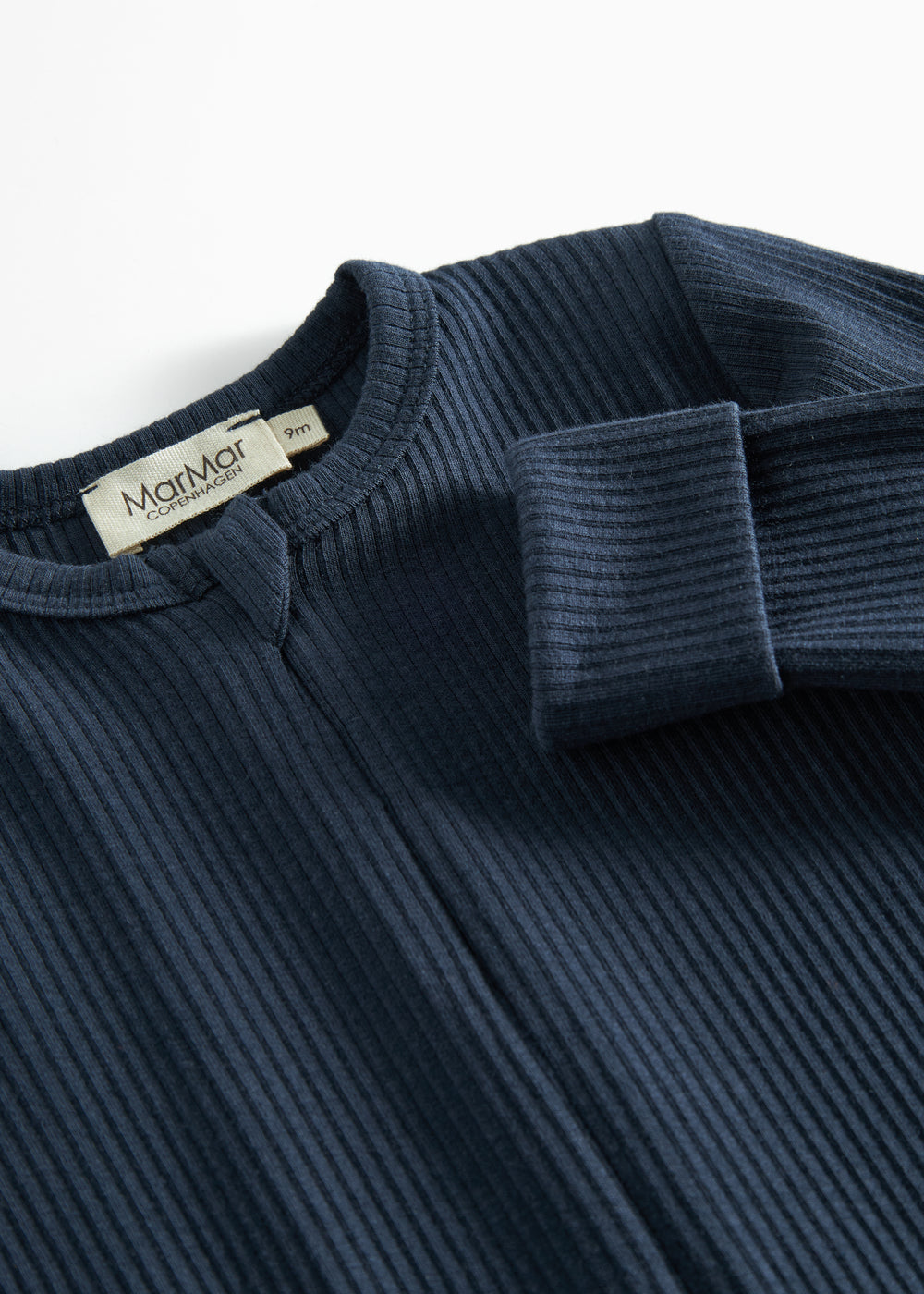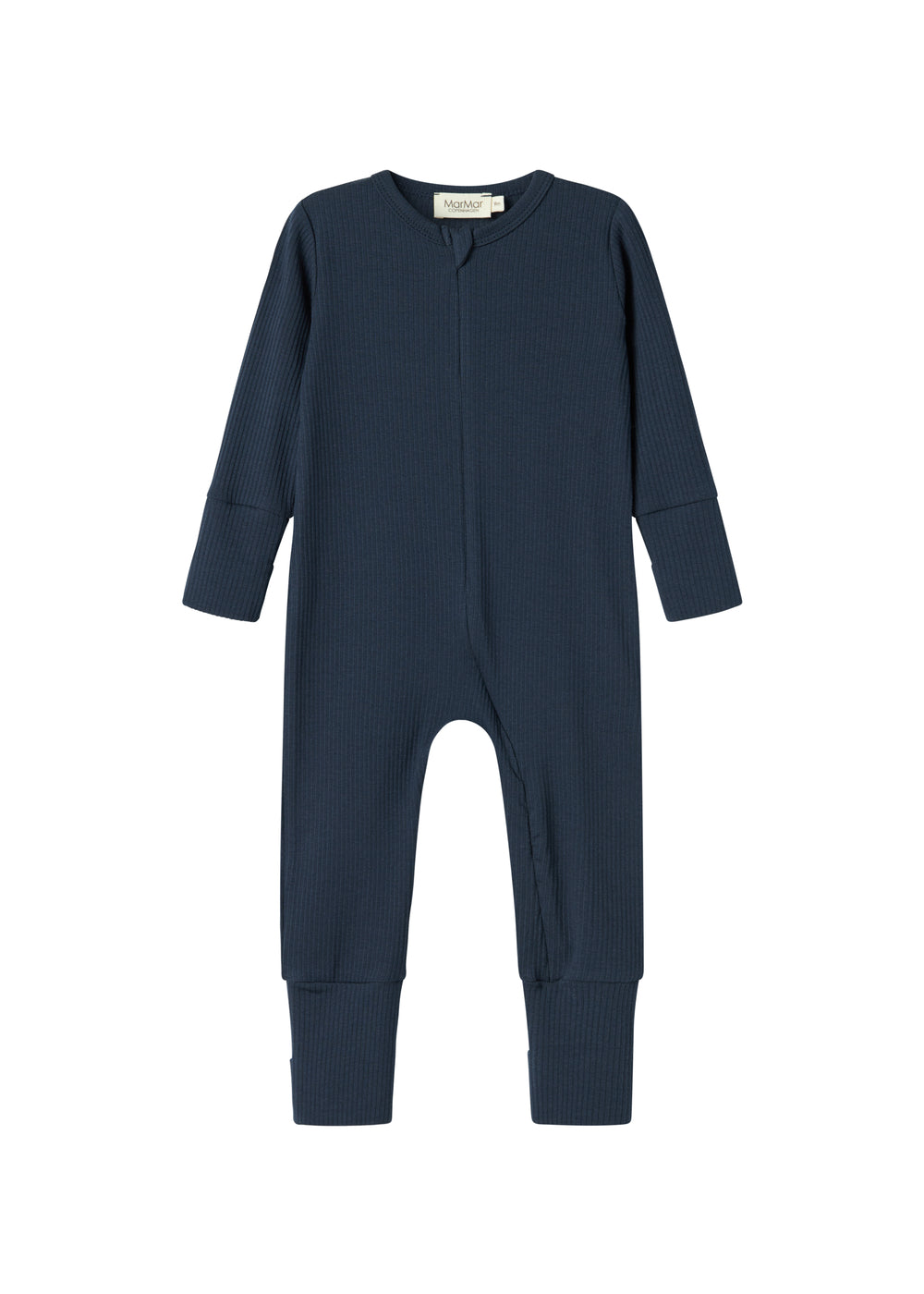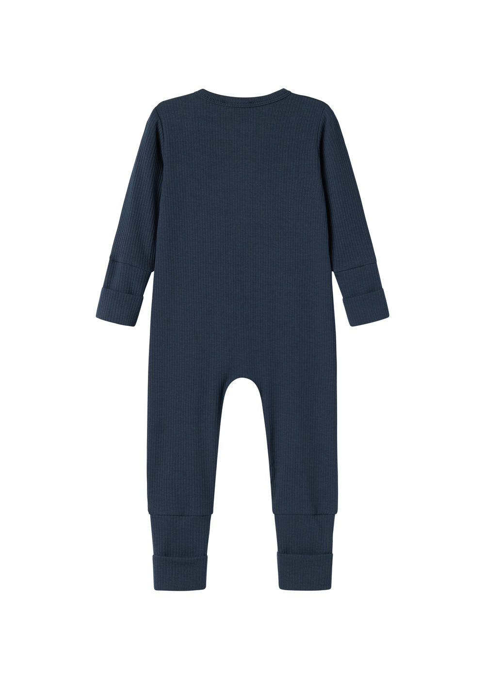 Simple long-sleeved jumpsuit that can be zipped all the way from the neck down one leg with a zipper for easy diaper changes. The jumpsuit has pleats at both sleeves and legs, which can be adjusted as the child grows. The jumpsuit also has a foldable mitten/sock function from size 2-4M. The jumpsuit is ribbed, soft, stretchy and comfortable to wear.