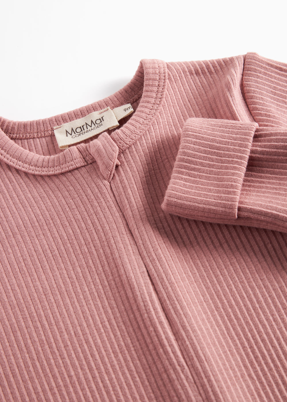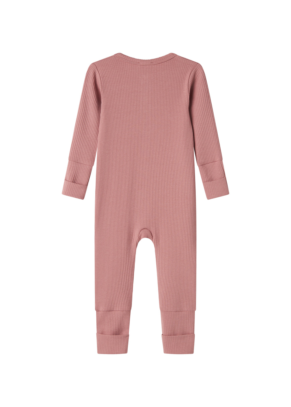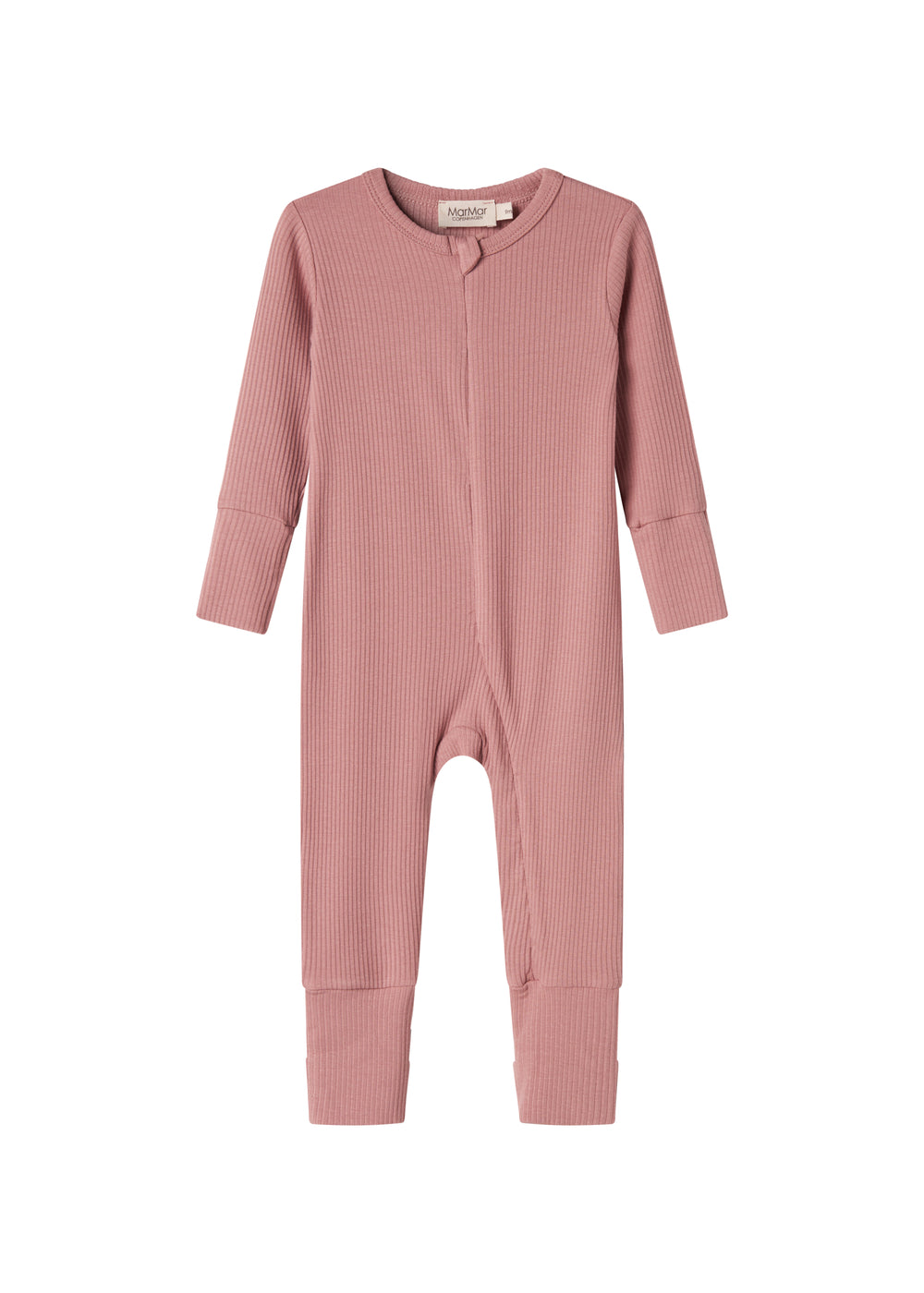Simple long-sleeved jumpsuit that can be zipped all the way from the neck down one leg with a zipper for easy diaper changes. The jumpsuit has pleats at both sleeves and legs, which can be adjusted as the child grows. The jumpsuit also has a foldable mitten/sock function from size 2-4M. The jumpsuit is ribbed, soft, stretchy and comfortable to wear.