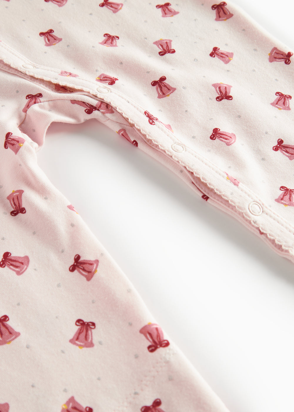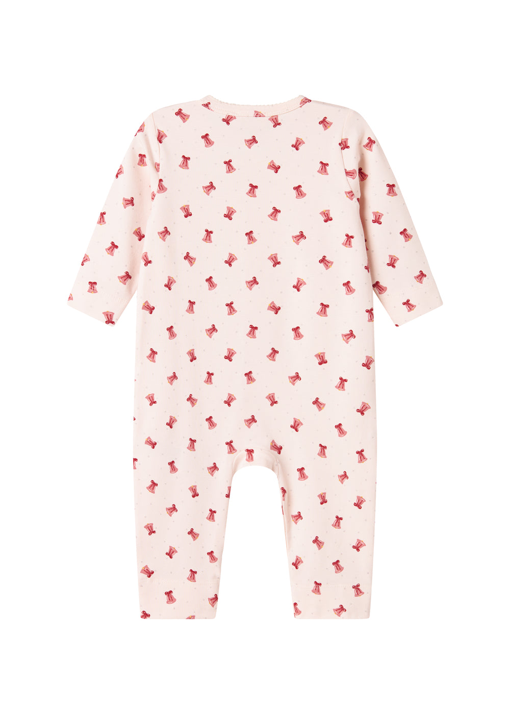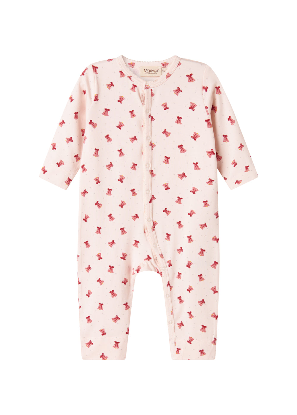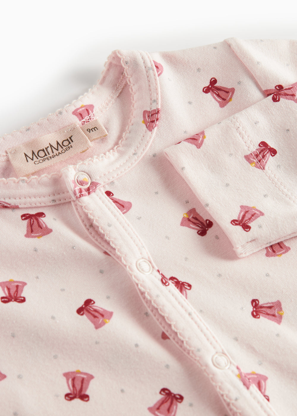 Spacious baby jumpsuit with snap closure all the way from the neckline to the trouser legs. The jumpsuit can be unbuttoned all the way up one leg for easy diaper changes. The jumpsuit has a nice print and picot edges and is both soft, stretchy and comfortable to wear.