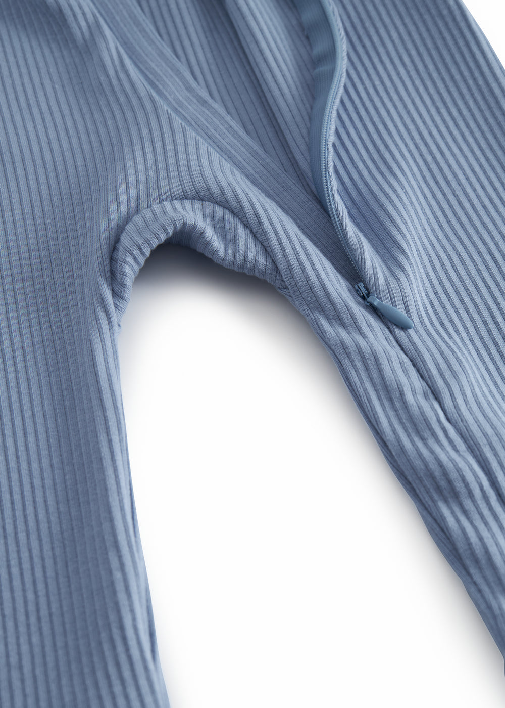 Simple long-sleeved jumpsuit that can be zipped all the way from the neck down one leg with a zipper for easy diaper changes. The jumpsuit has pleats at both sleeves and legs, which can be adjusted as the child grows. The jumpsuit also has a foldable mitten/sock function from size 2-4M. The jumpsuit is ribbed, soft, stretchy and comfortable to wear.