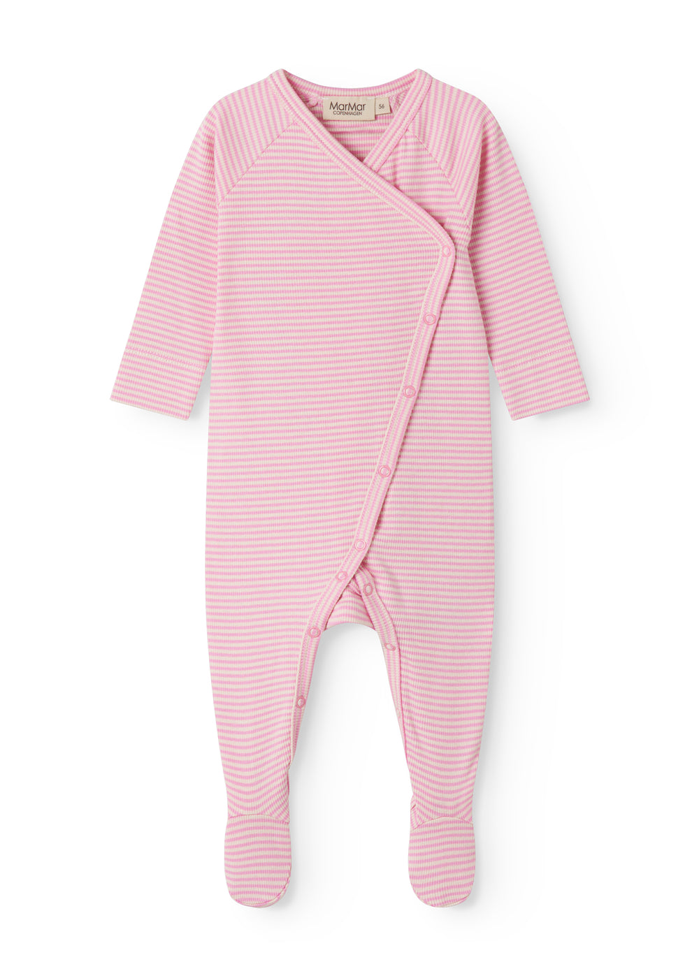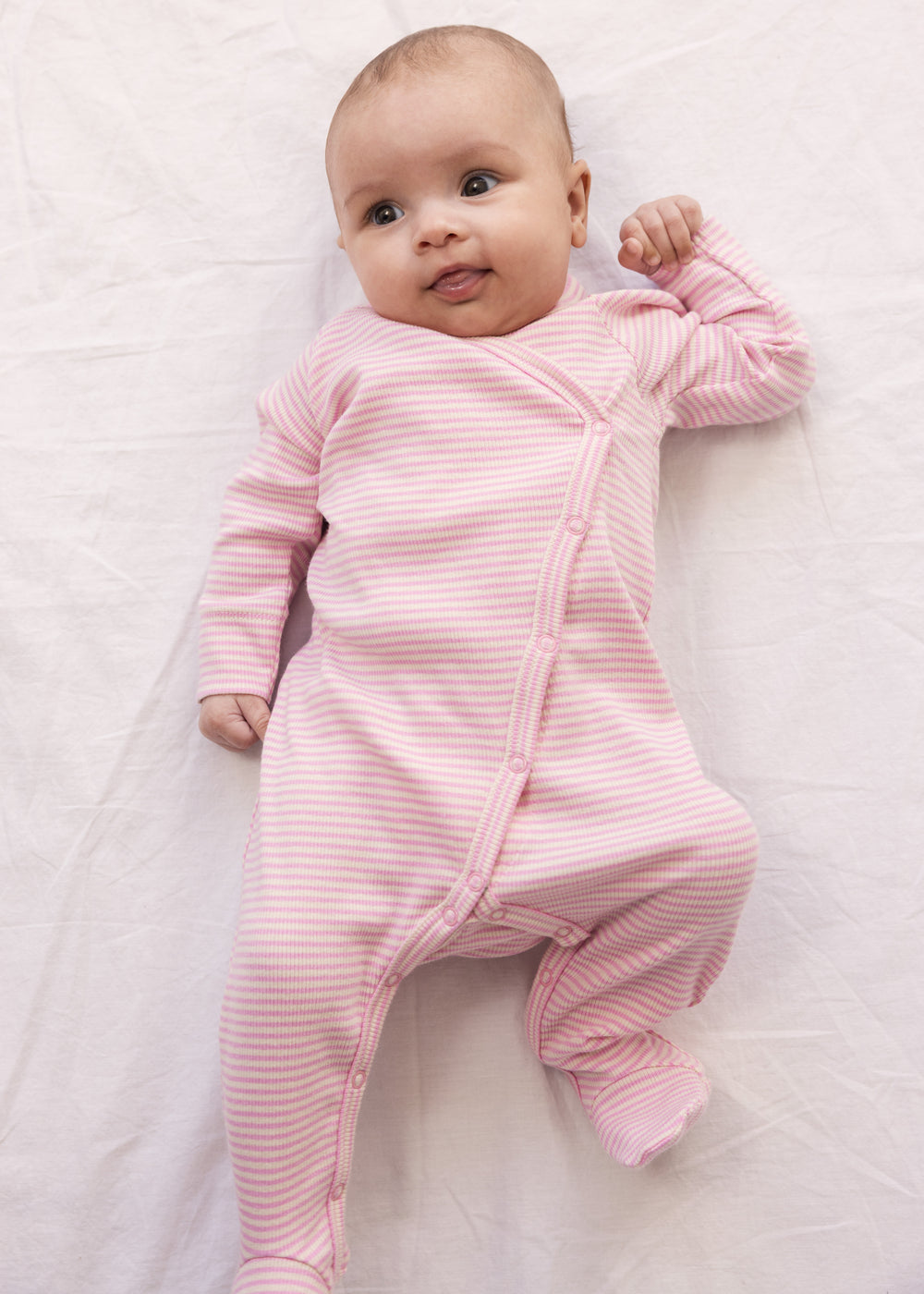 Long-sleeved onesie with feet and fine stripes. The onesie has a practical wrap-around closure that closes with small discreet snaps all the way down and between the legs for easy diaper changes. The onesie is soft, stretchy and comfortable to wear.