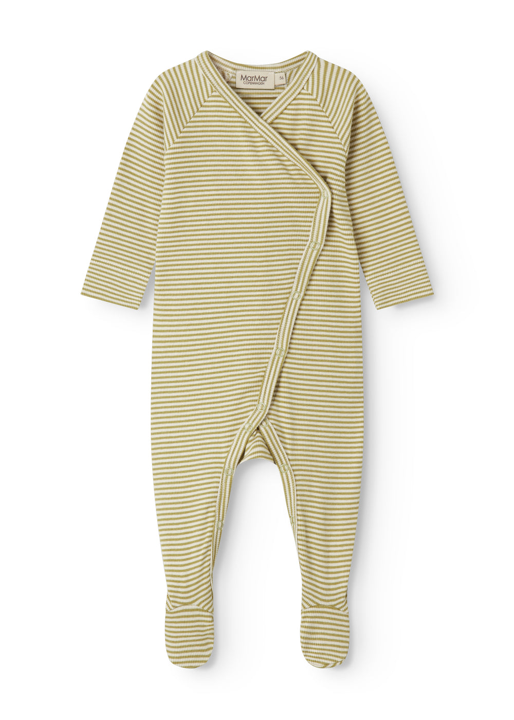 Long-sleeved onesie with feet and fine stripes. The onesie has a practical wrap-around closure that closes with small discreet snaps all the way down and between the legs for easy diaper changes. The onesie is soft, stretchy and comfortable to wear.