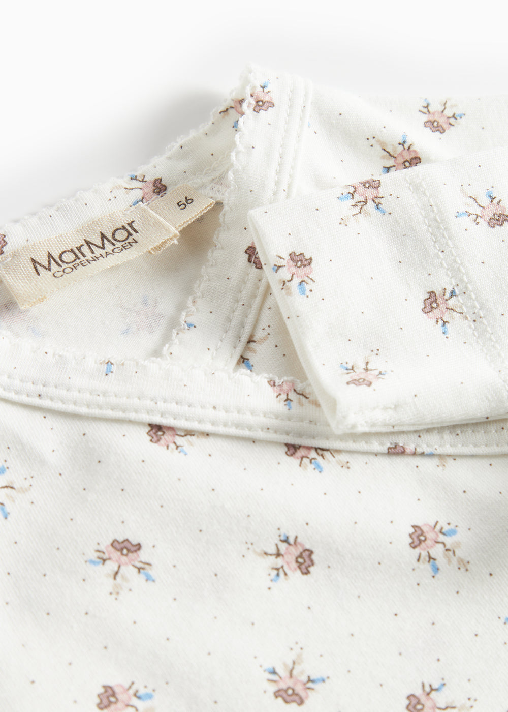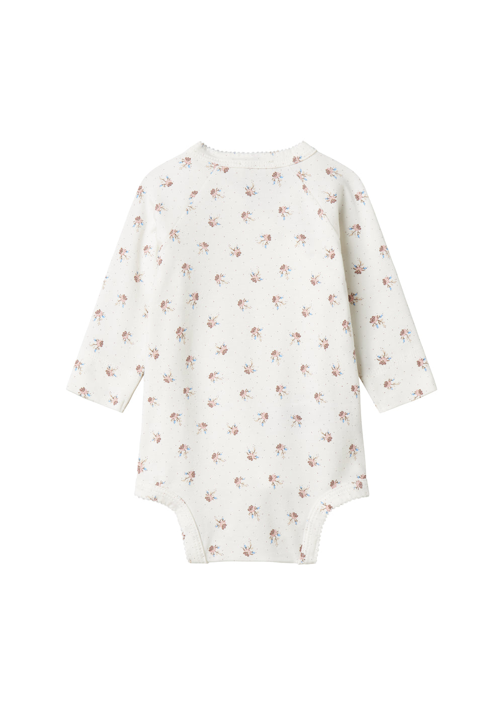 Long-sleeved bodystocking for newborns with a wrap-around closure. The bodystocking closes with snaps, has a nice print and is both soft, stretchy and comfortable to wear.